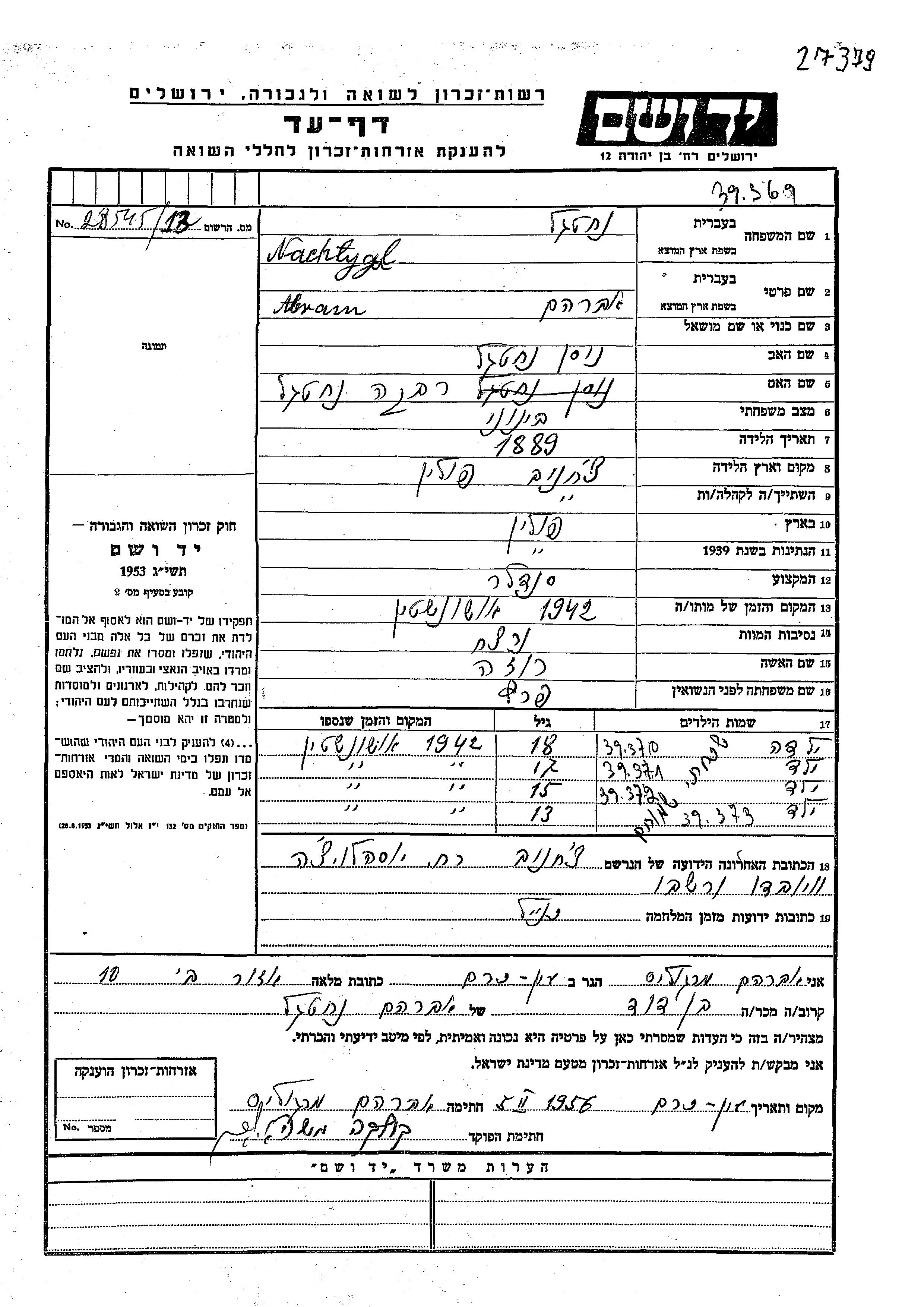 Yad Vashem - Pages of Testimony Names Memorial Collection