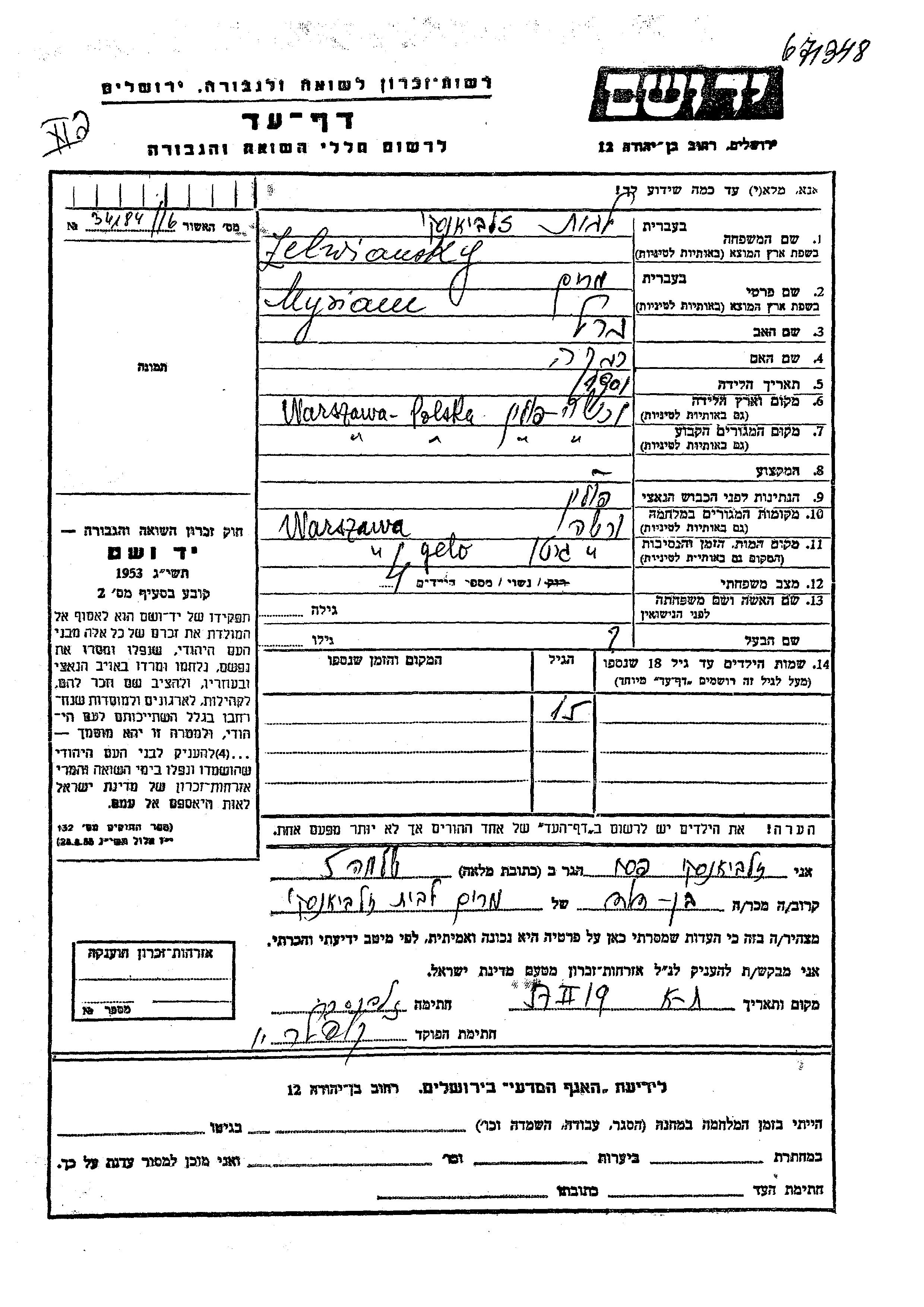 Zelwiansky prénom inconnu Varsha, Pologne Feuille de témoignage