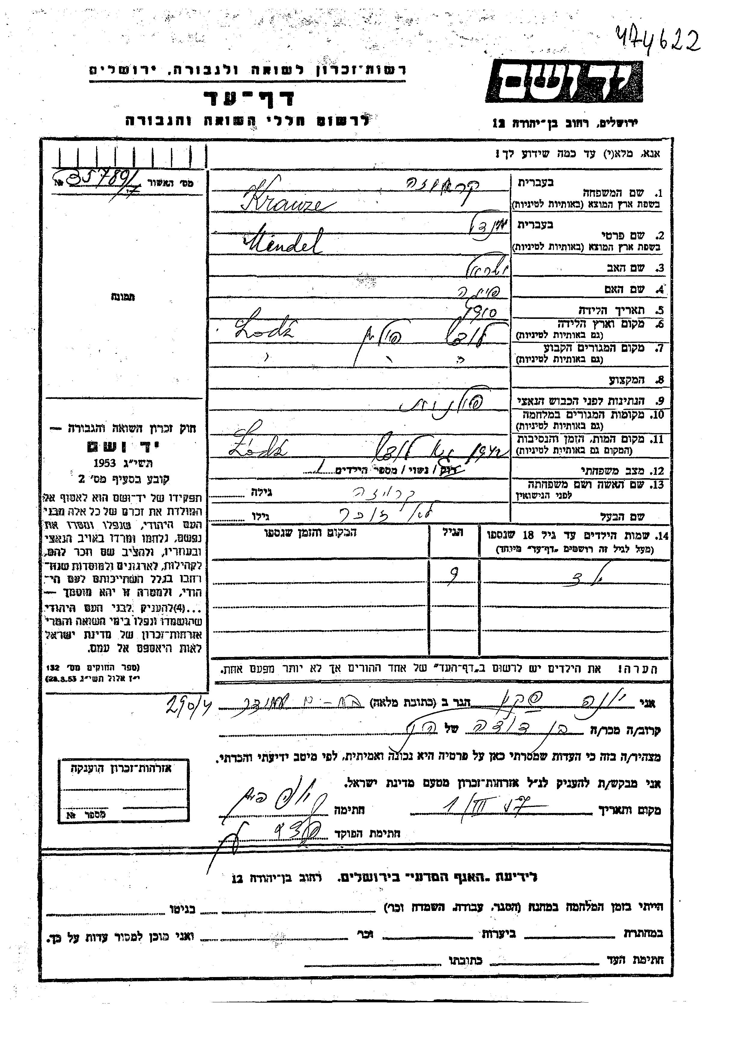 Krauze prénom inconnu Lodz, Pologne Feuille de témoignage