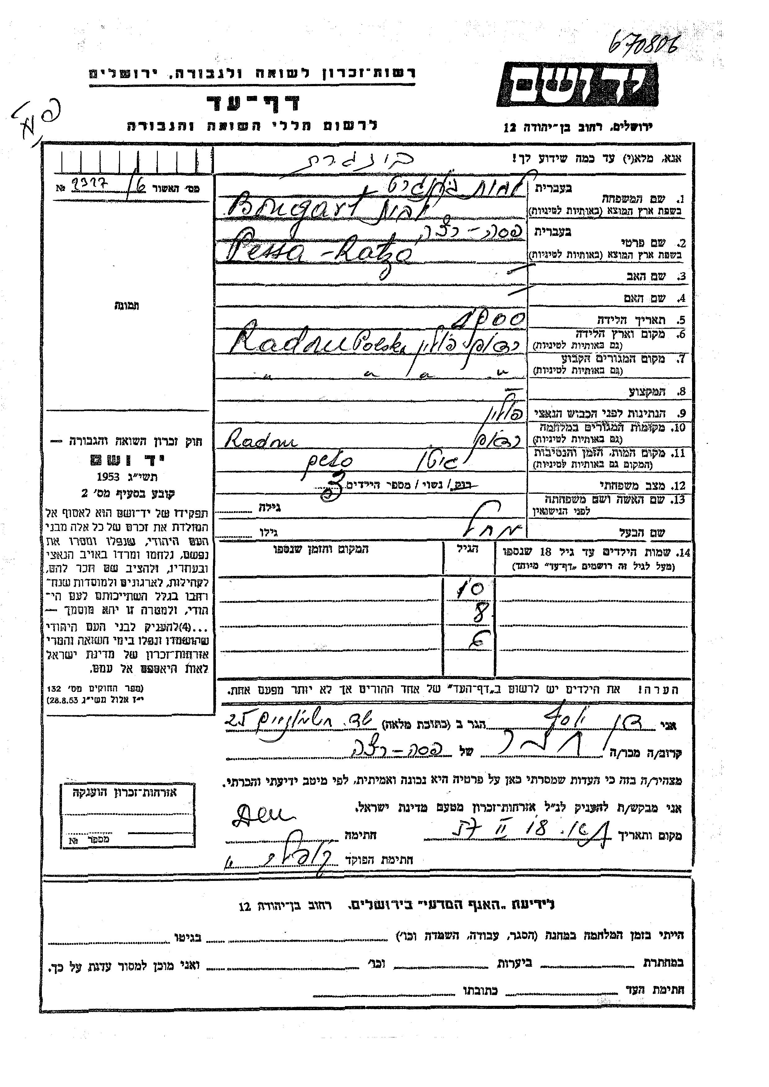 prénom inconnu Bongart est né/e fils/fille de Mekhel et de Pessa Ratza Pesa née Bongart. Il/elle était Enfant. Avant la seconde guerre mondiale vivait à Radom, Pologne. Au cours de la guerre elle était à Radom, Pologne.