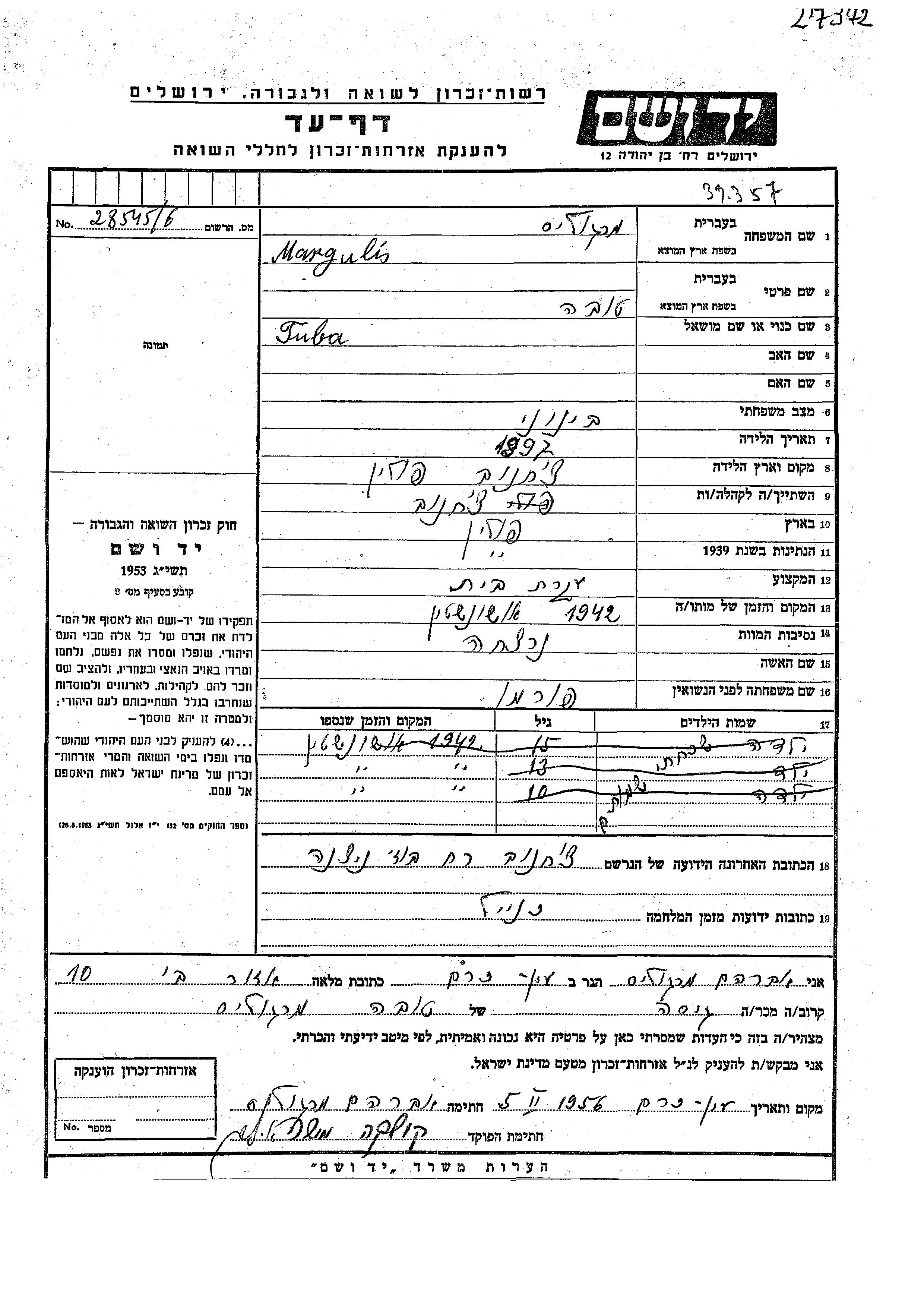 Margulis prénom inconnu Czechanow, Pologne Feuille de témoignage