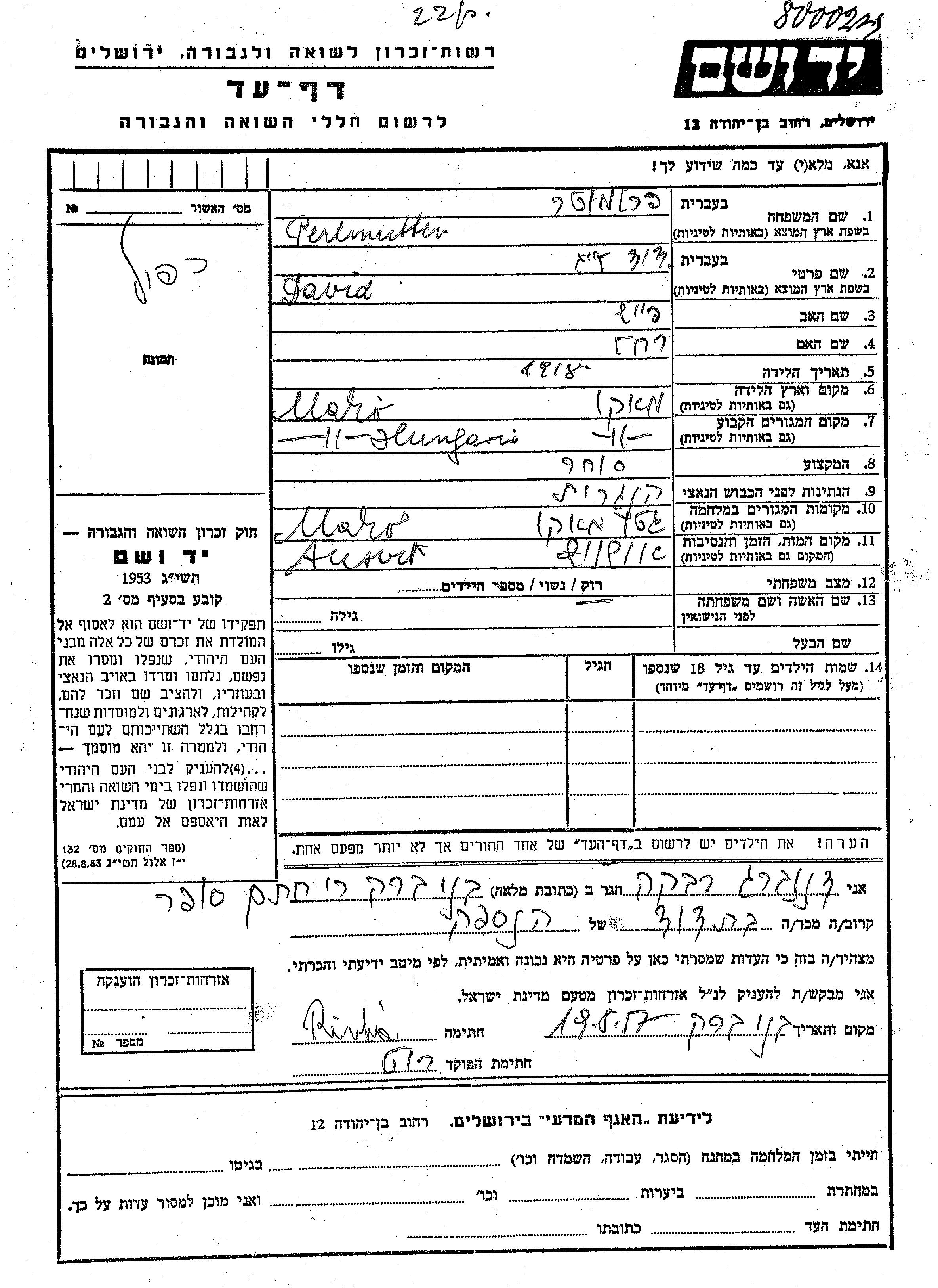 Perlmutter David Leib 1918 Mako, Hongrie Feuille de témoignage