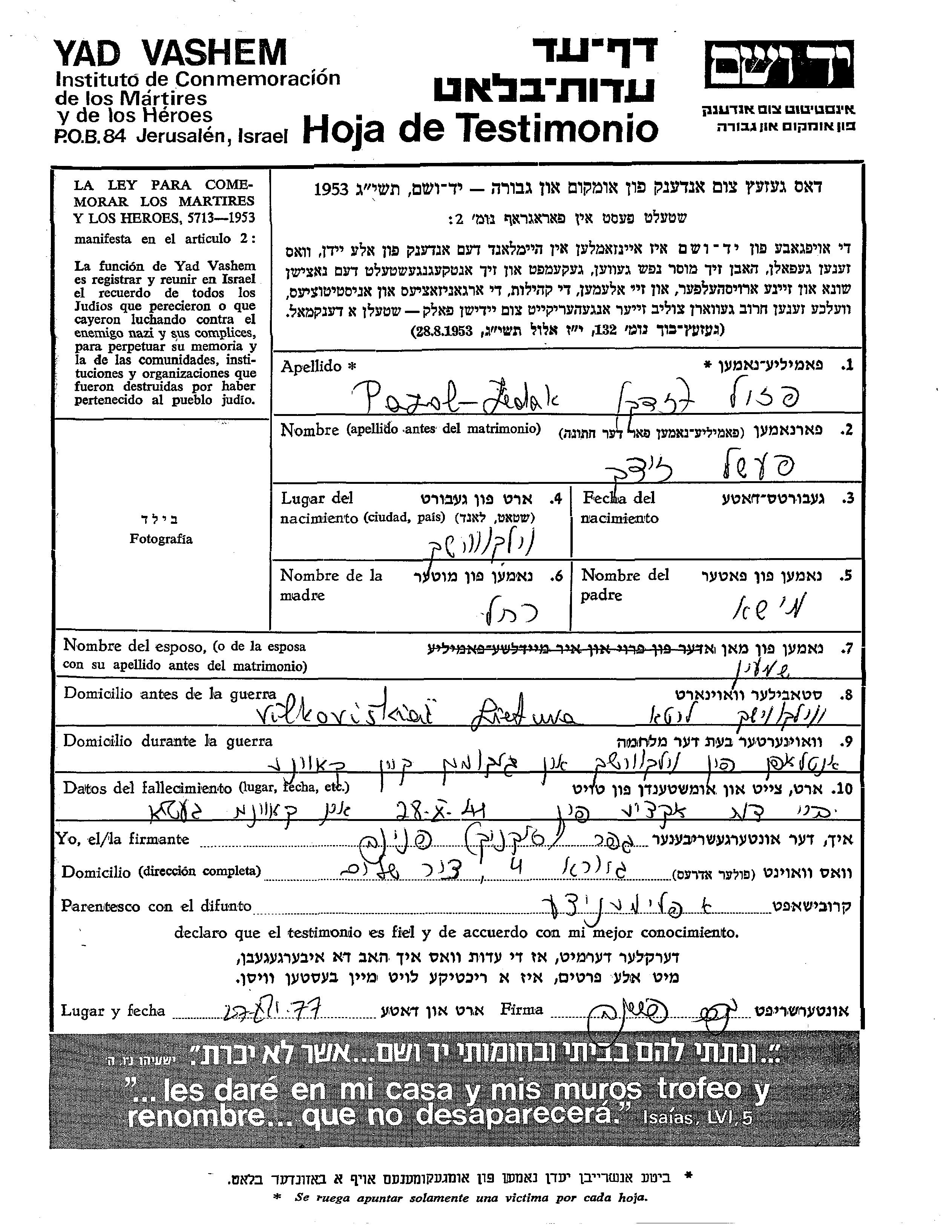 Pazol Peshl Vilkovishk, Lituanie Feuille de témoignage