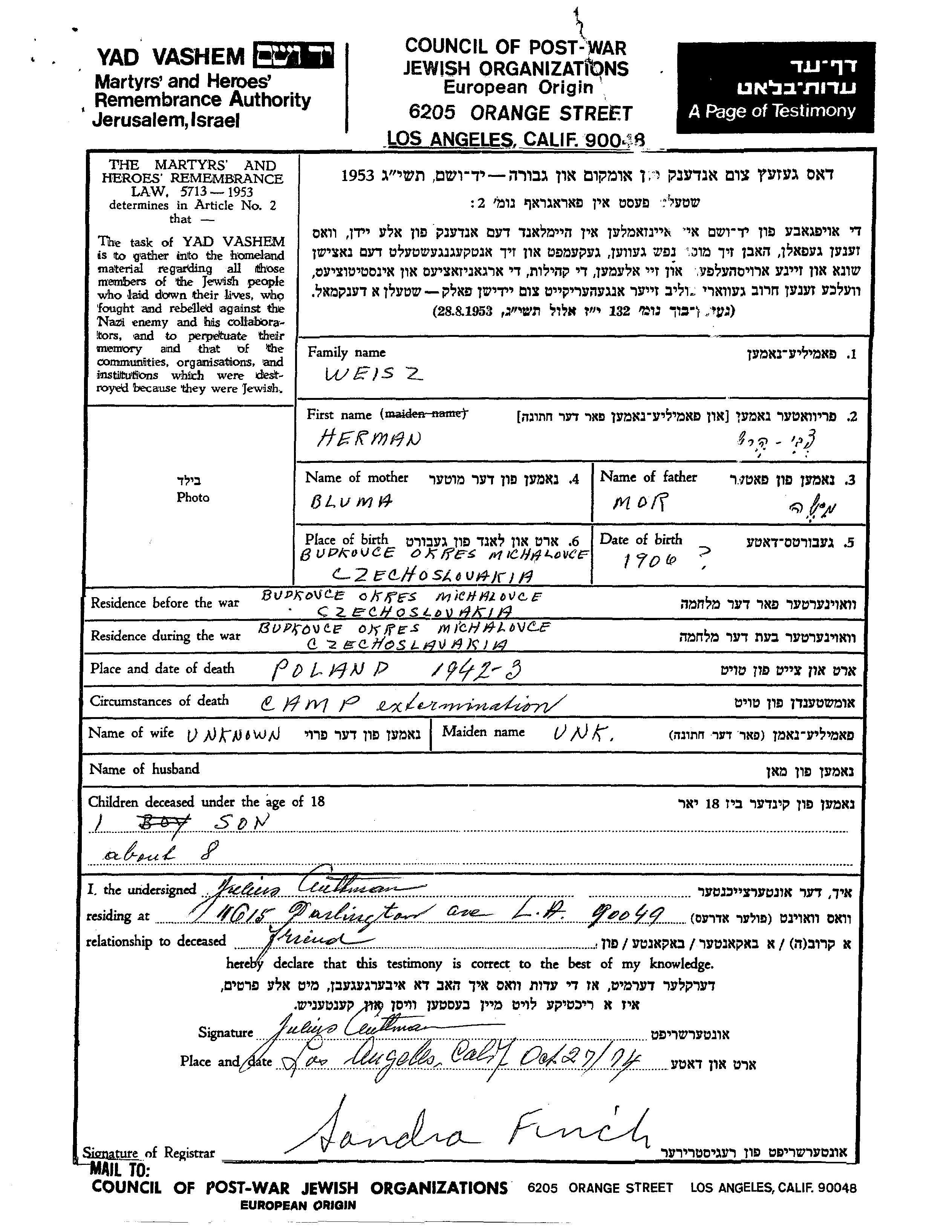 Yad Vashem - Pages of Testimony Names Memorial Collection