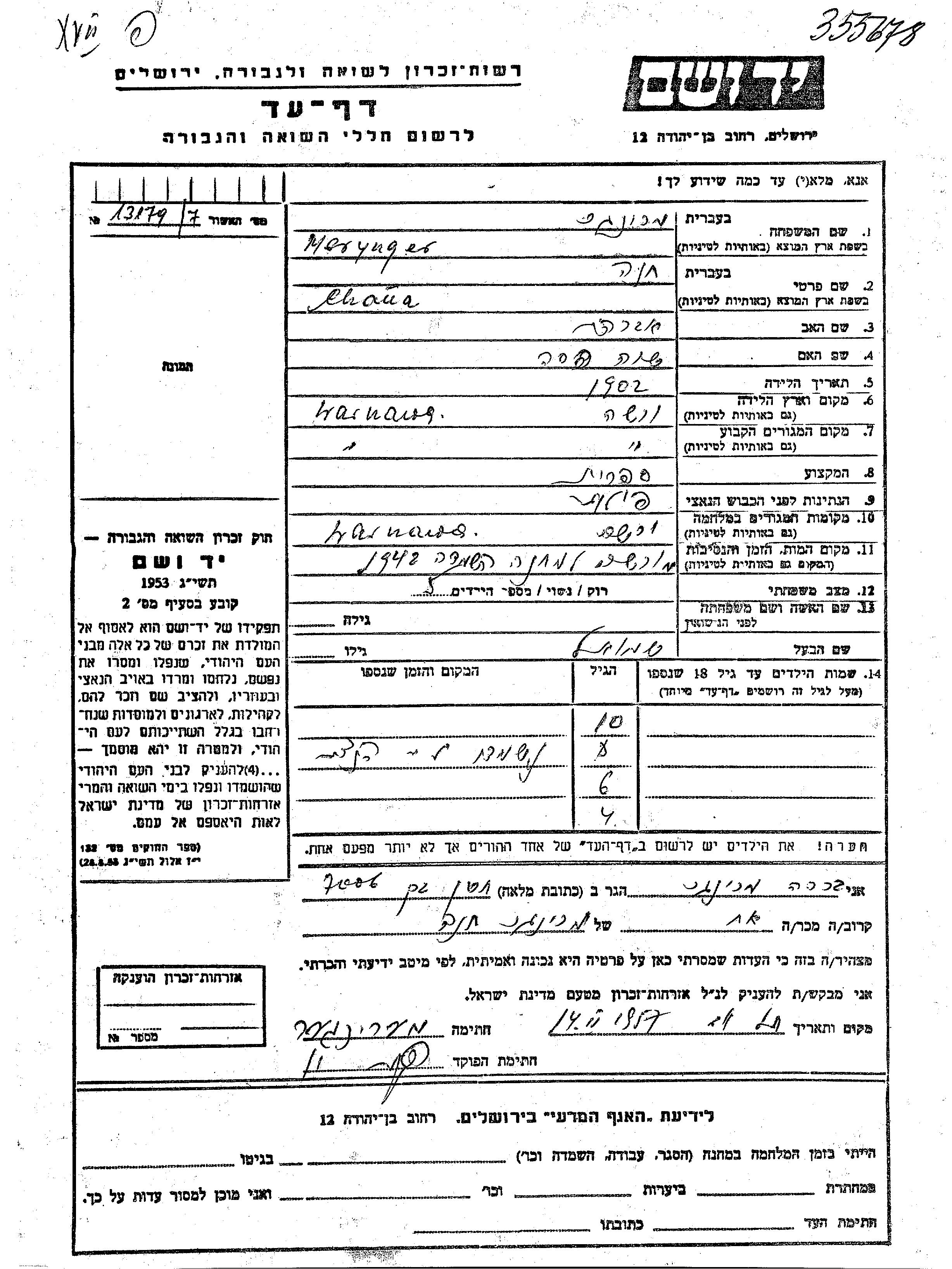Merynger prénom inconnu Warsaw, Pologne Feuille de témoignage