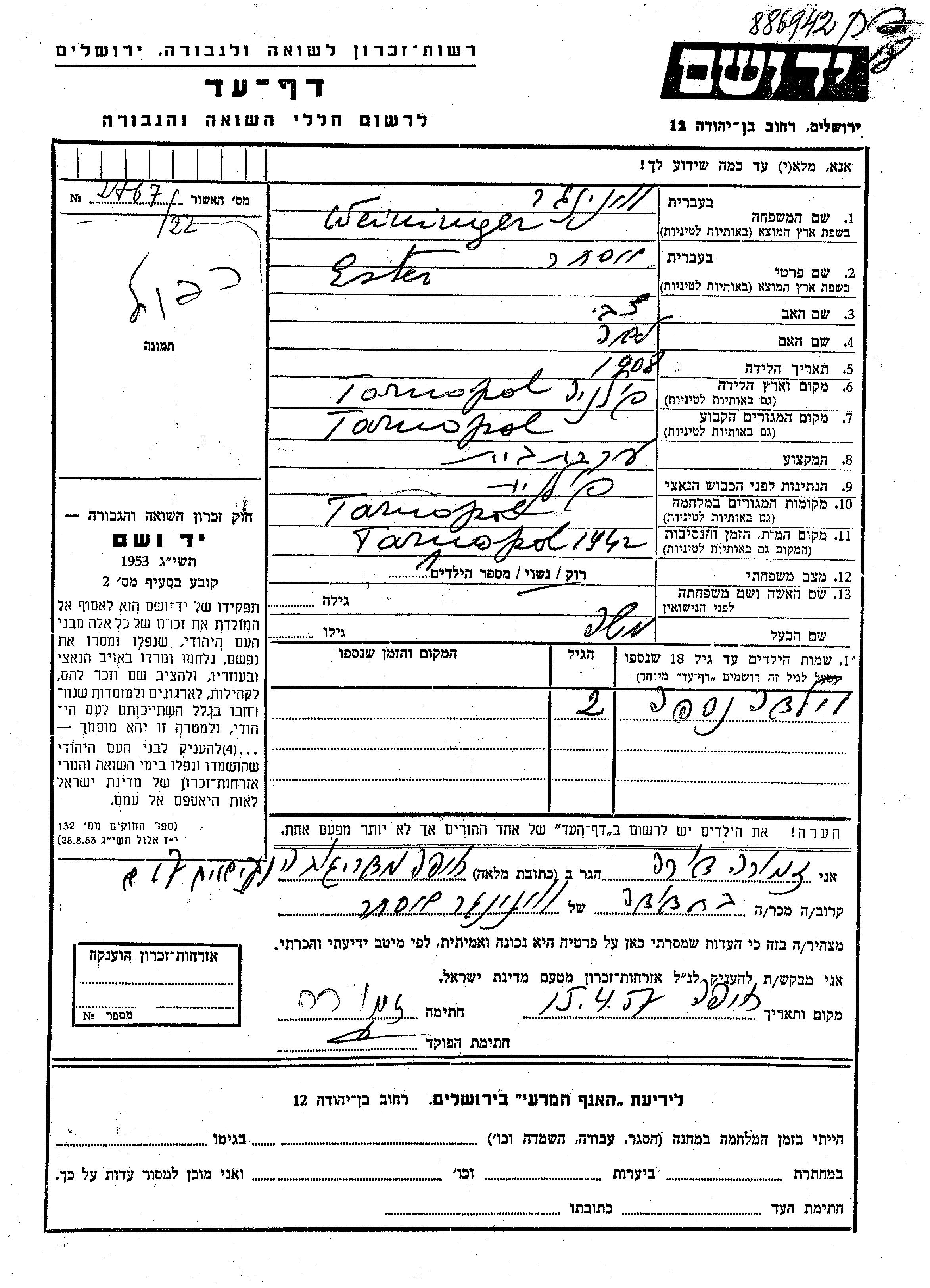 Weininger prénom inconnu Tarnopol, Pologne Feuille de témoignage