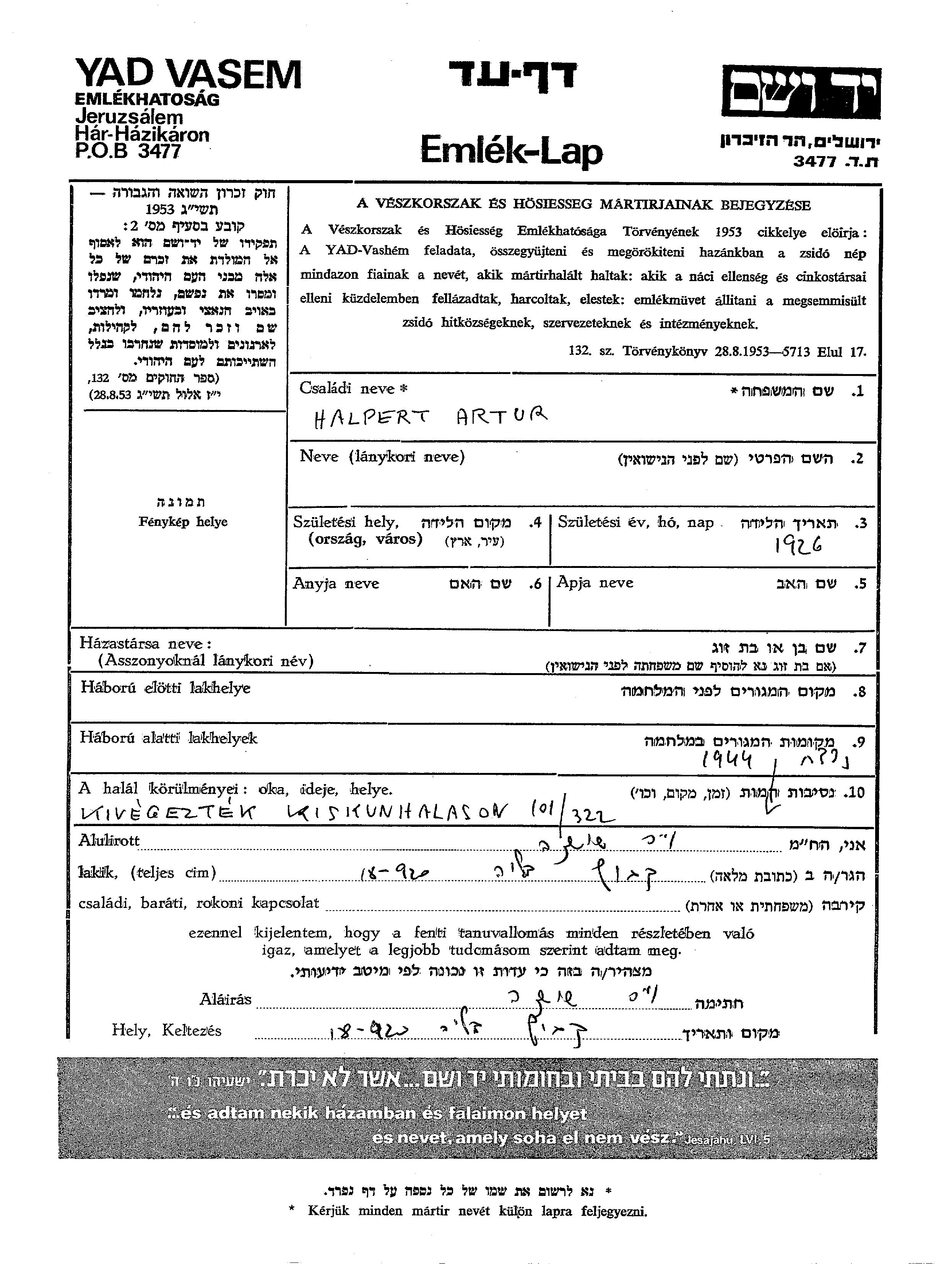 Halpert Artur 1926 endroit inconnu, Feuille de témoignage
