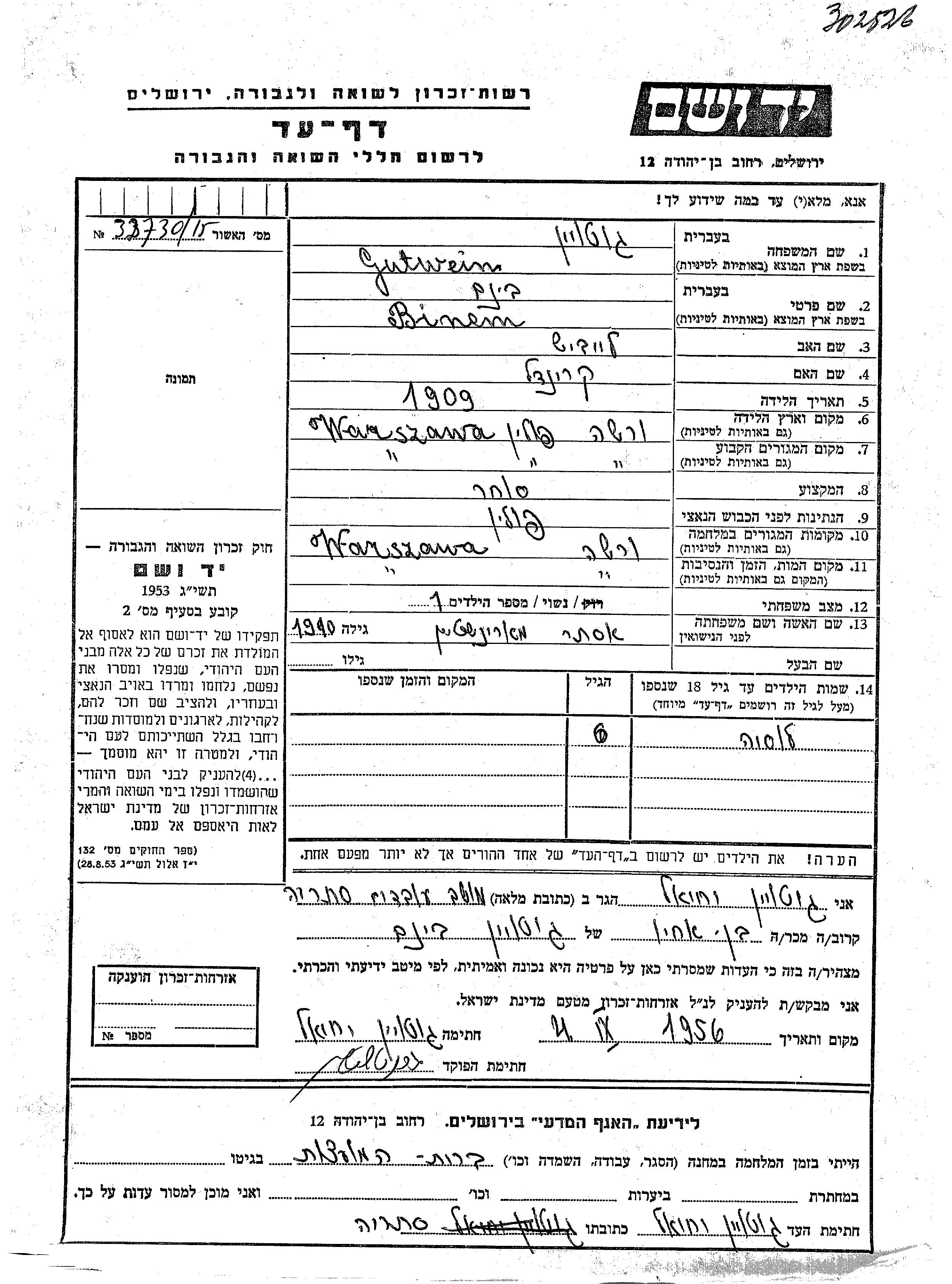Gutwein Binem 1909 Warszawa, Pologne Feuille de témoignage