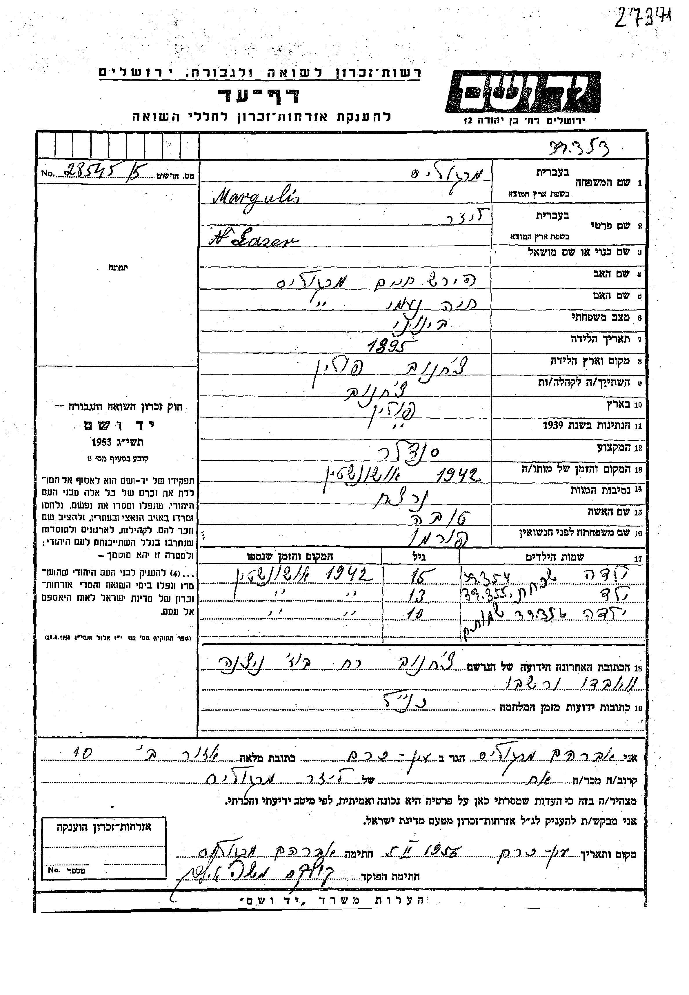 Margulis prénom inconnu Cechnow, Pologne Feuille de témoignage
