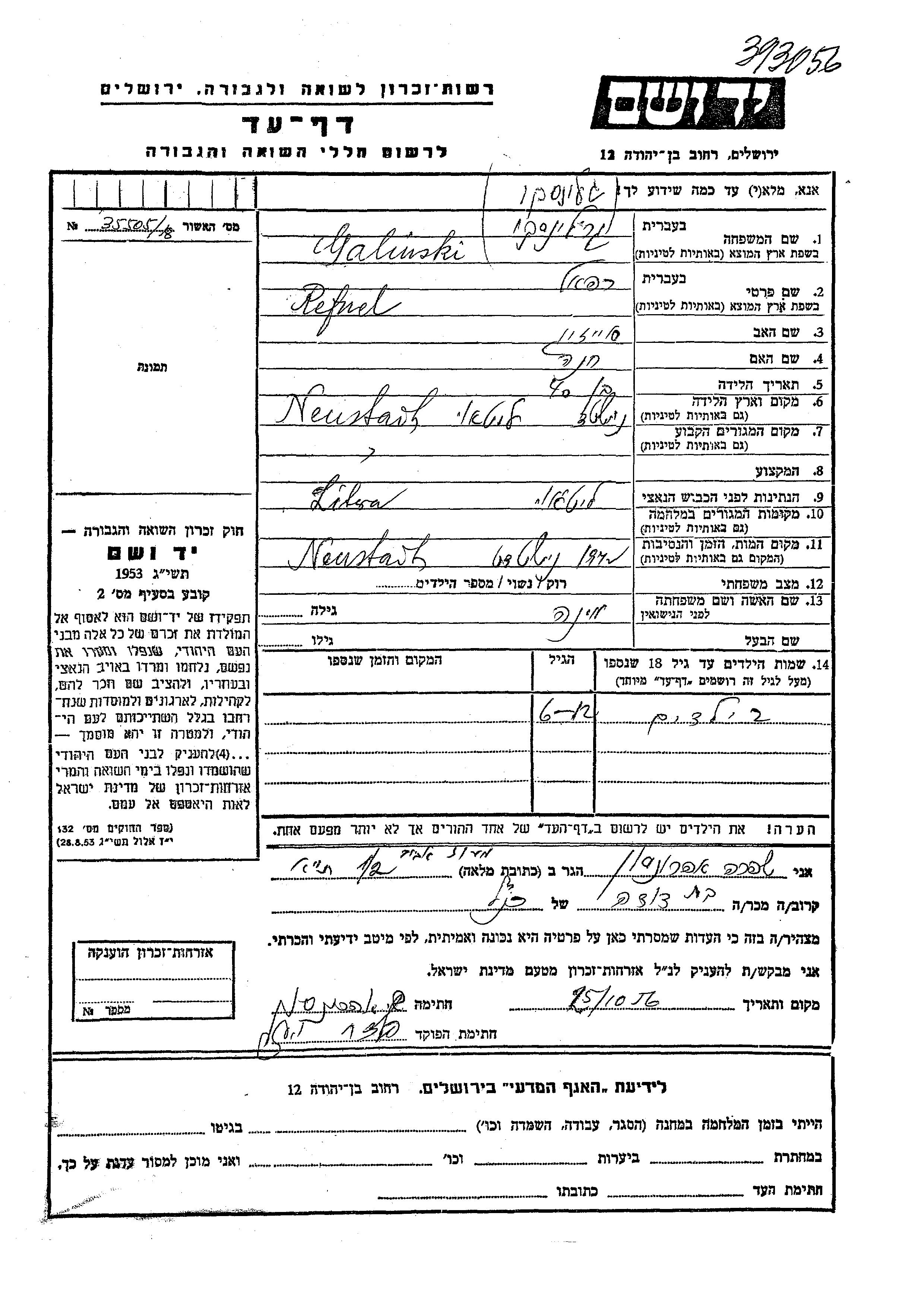 Yad Vashem - Pages of Testimony Names Memorial Collection
