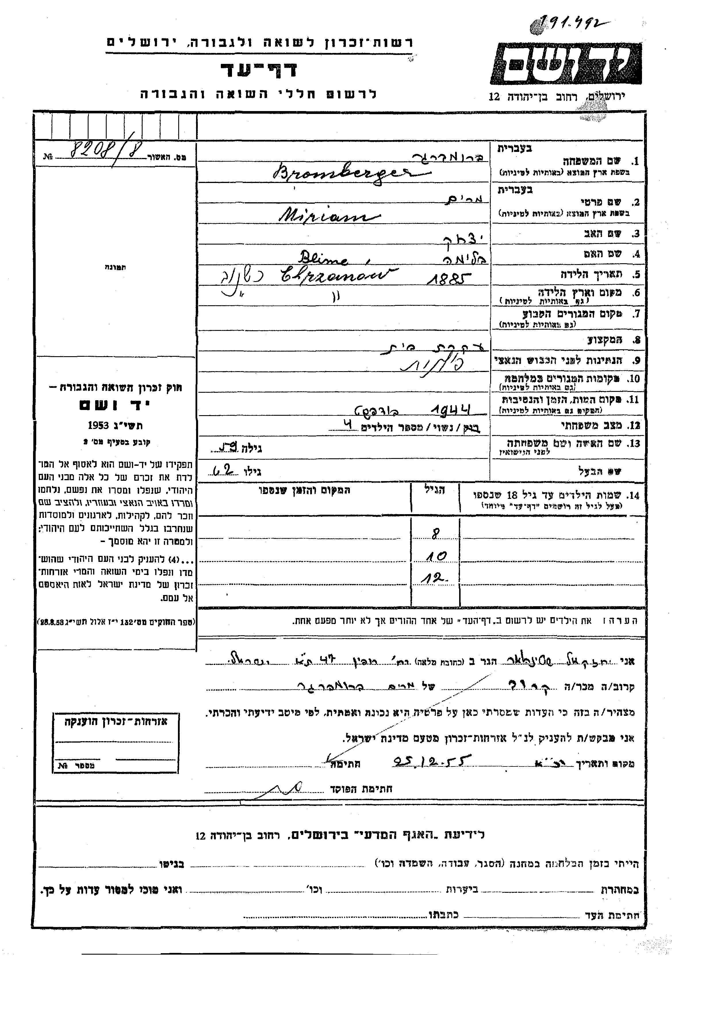 Bromberger prénom inconnu endroit inconnu, Feuille de témoignage