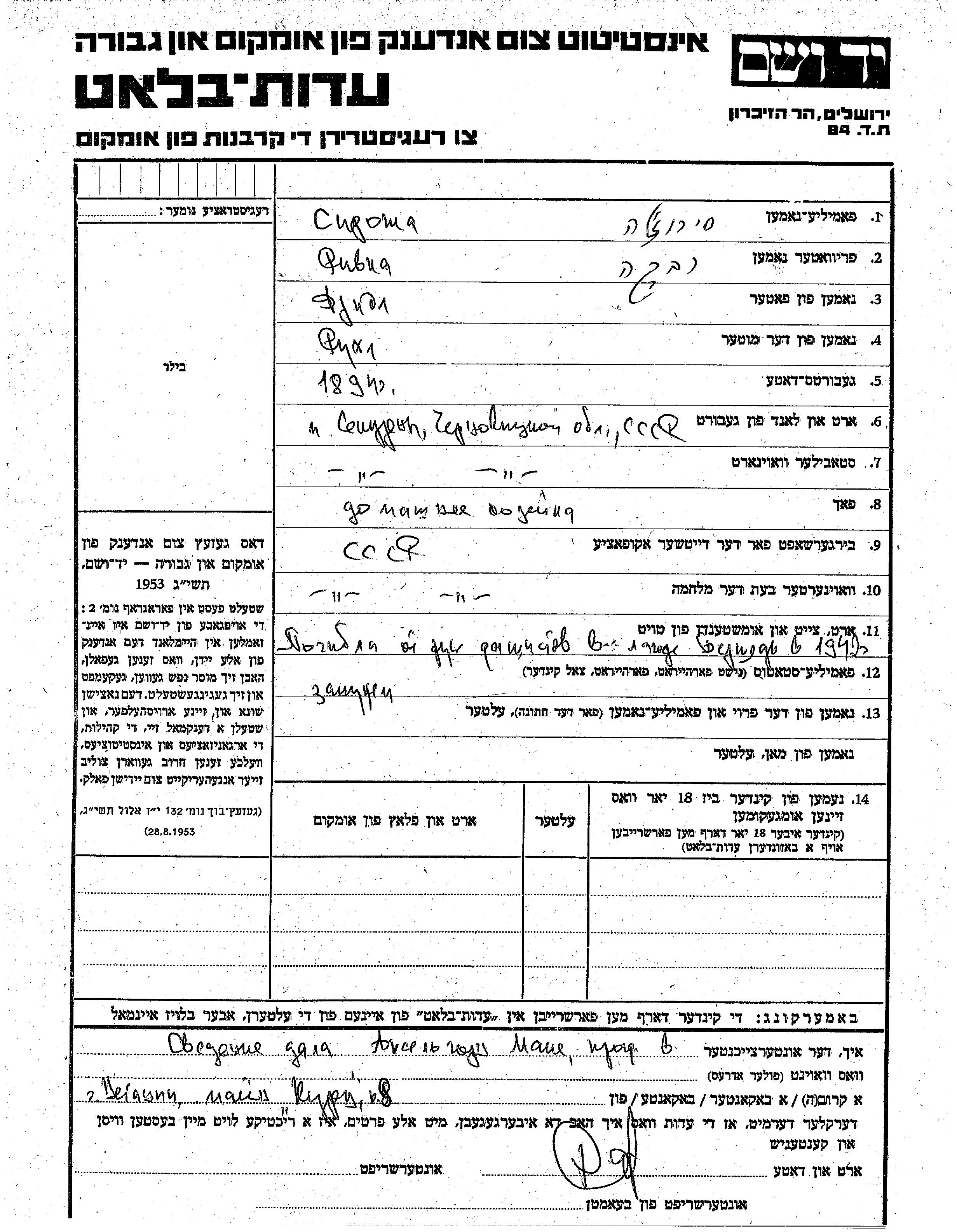 Sirota Rivka 1894 Czernowitz, Roumanie Feuille de témoignage