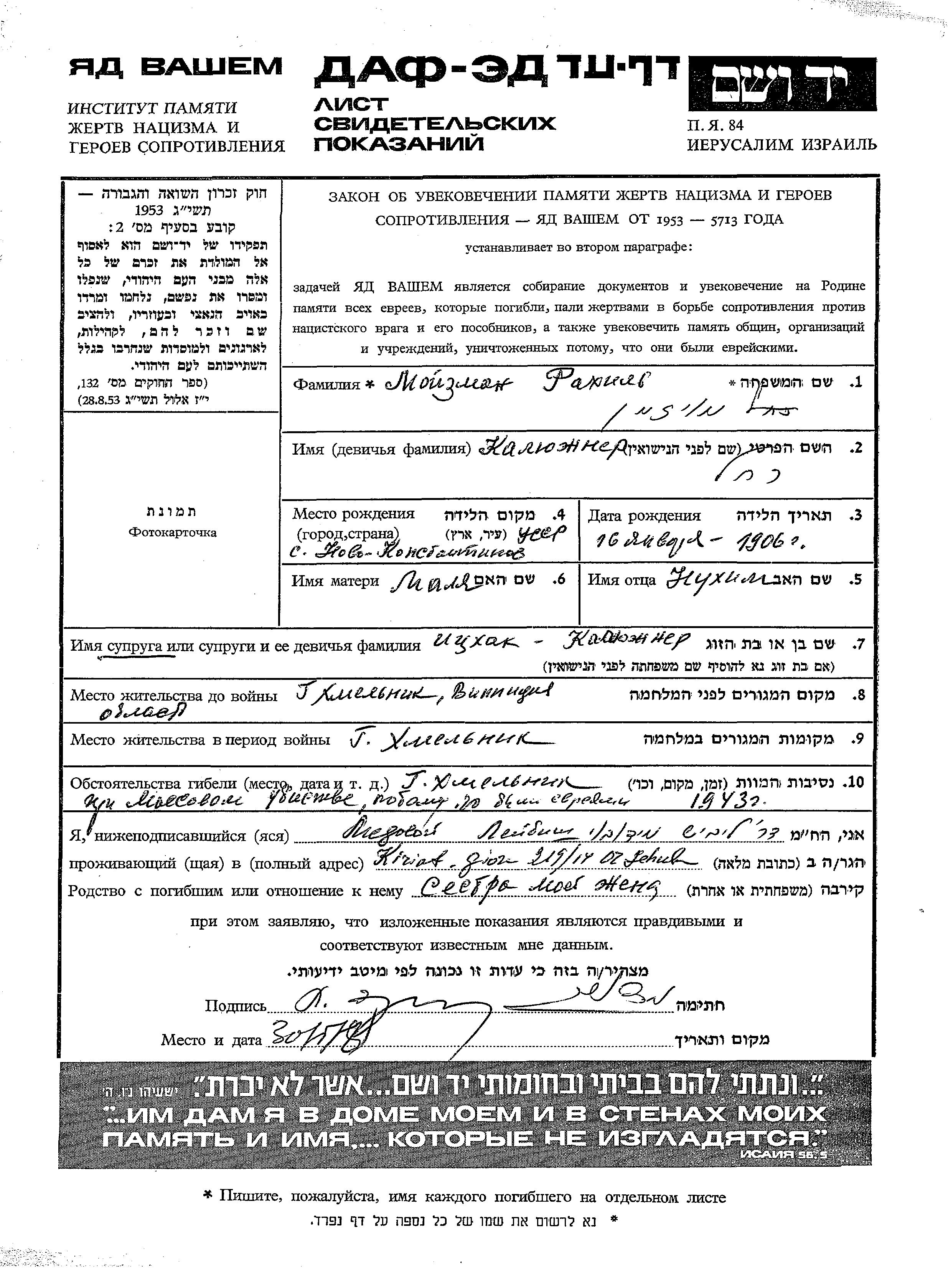 Kalyuzhner Moizman Rakhil 1906 Khmelnik, Ukraine (URSS) Feuille de témoignage