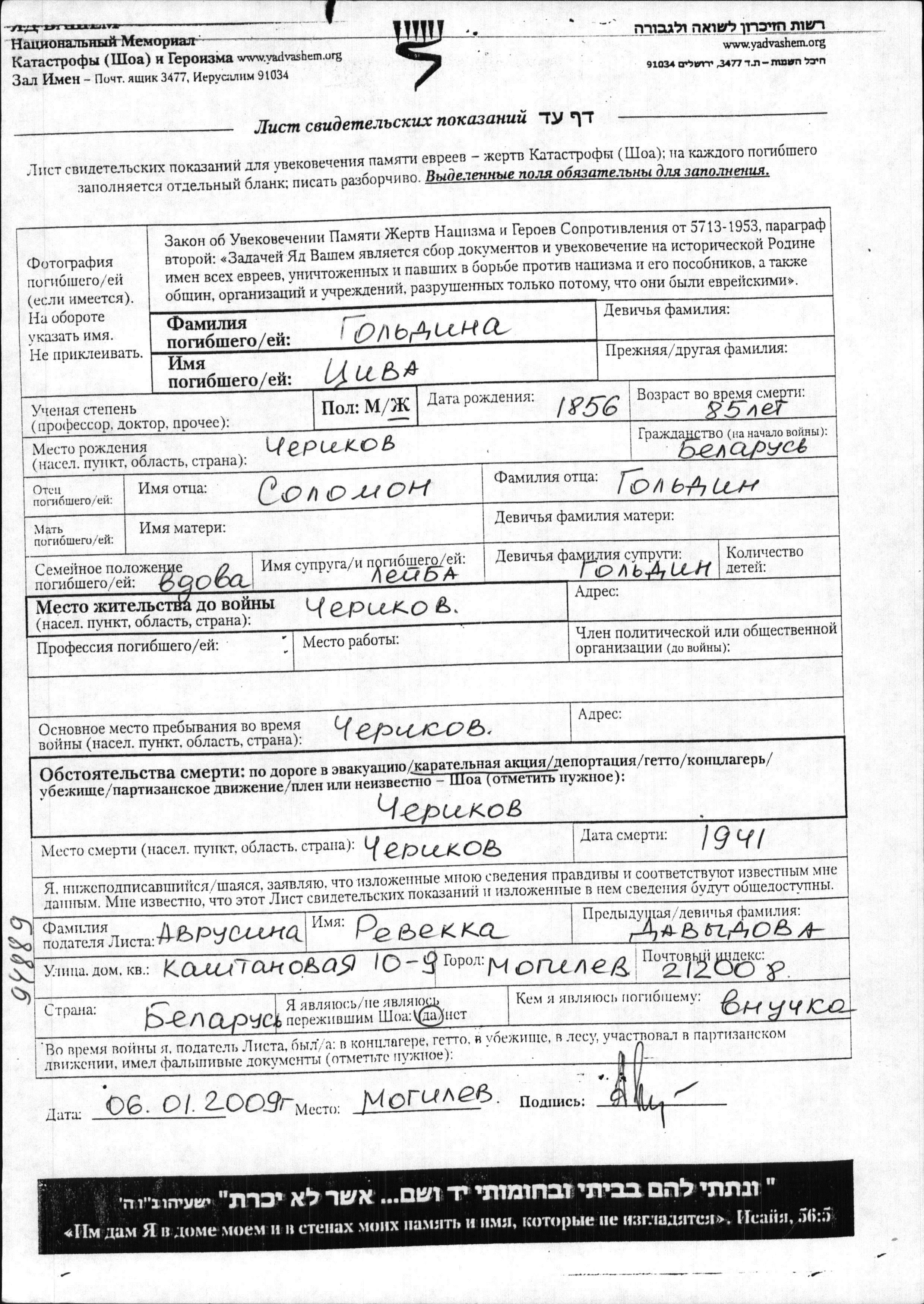 Goldina Tziva 1856 Cherikov, Bélorussie (URSS) Feuille de témoignage