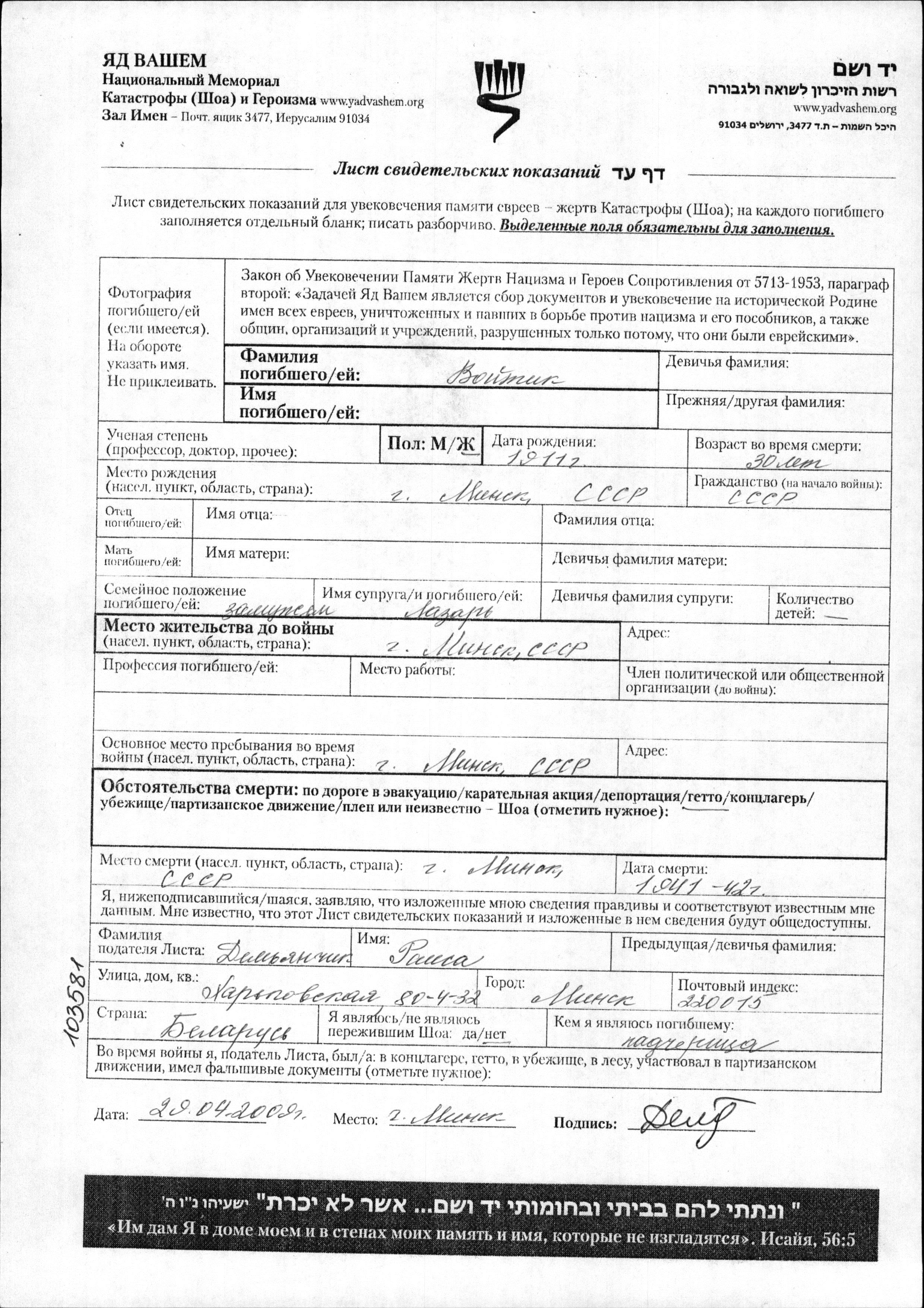 Voytik prénom inconnu 1911 Minsk, Bélorussie (URSS) Feuille de témoignage