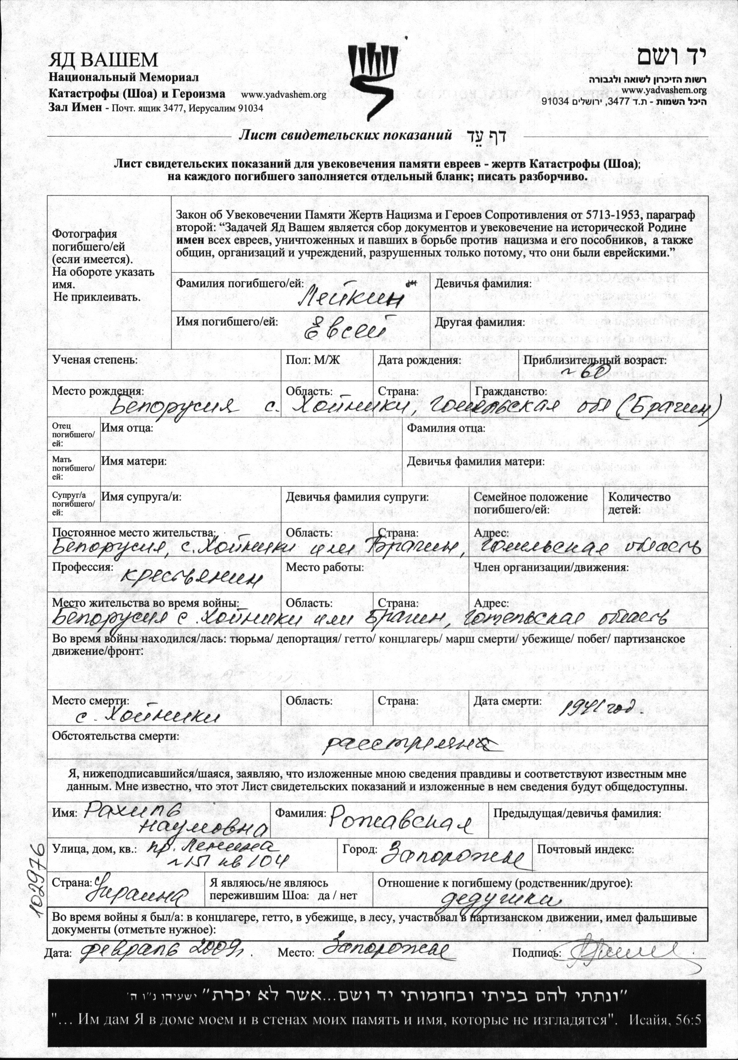 Leikin Yevsei Khoiniki, Bélorussie (URSS) Feuille de témoignage