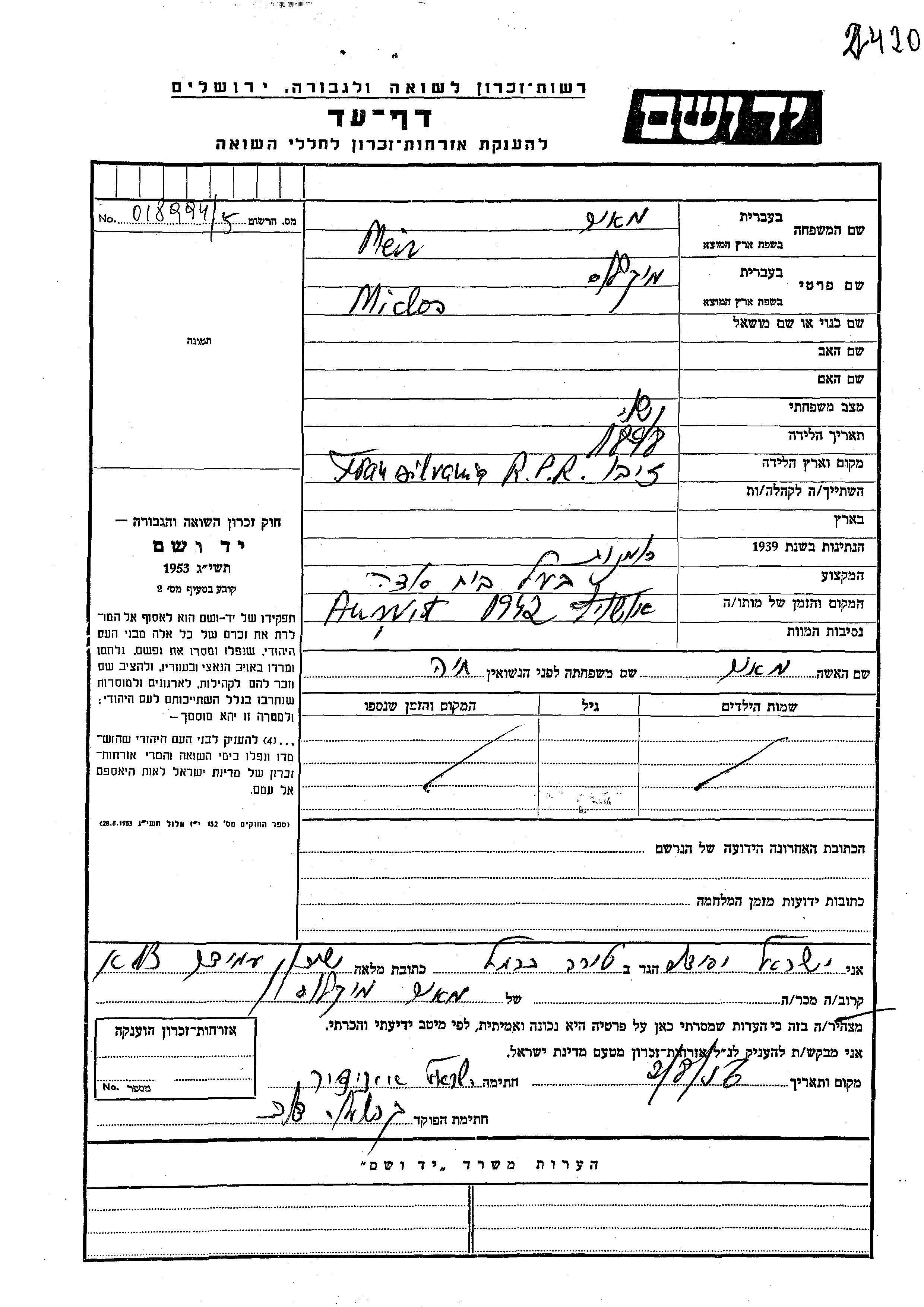 Miclos a été assassiné pendant la Shoah. Lieu de la mort: Auschwitz, Pologne en 1942.
