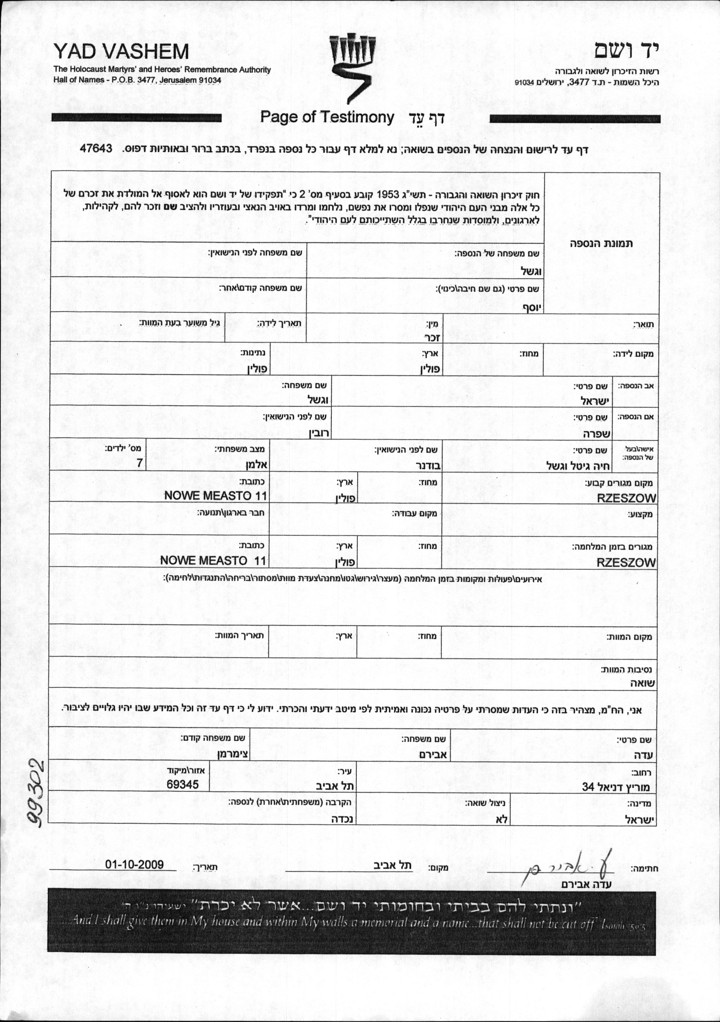 Vagshal Joseph Rzeszow, Pologne Feuille de témoignage (digitale-signée)