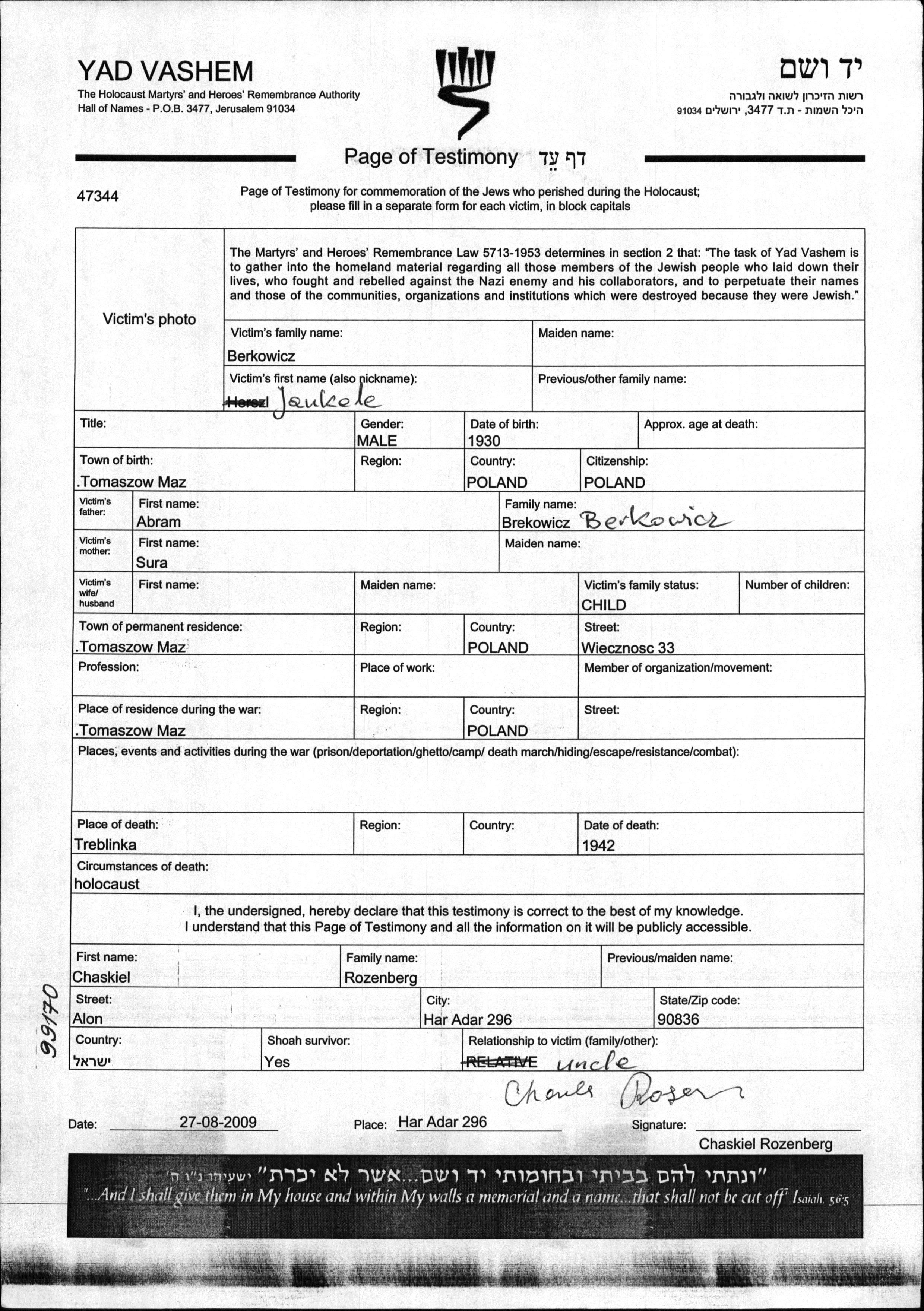Berkowicz Jankele 1930 Tomaszow Mazowiecki, Pologne Feuille de témoignage (digitale-signée)