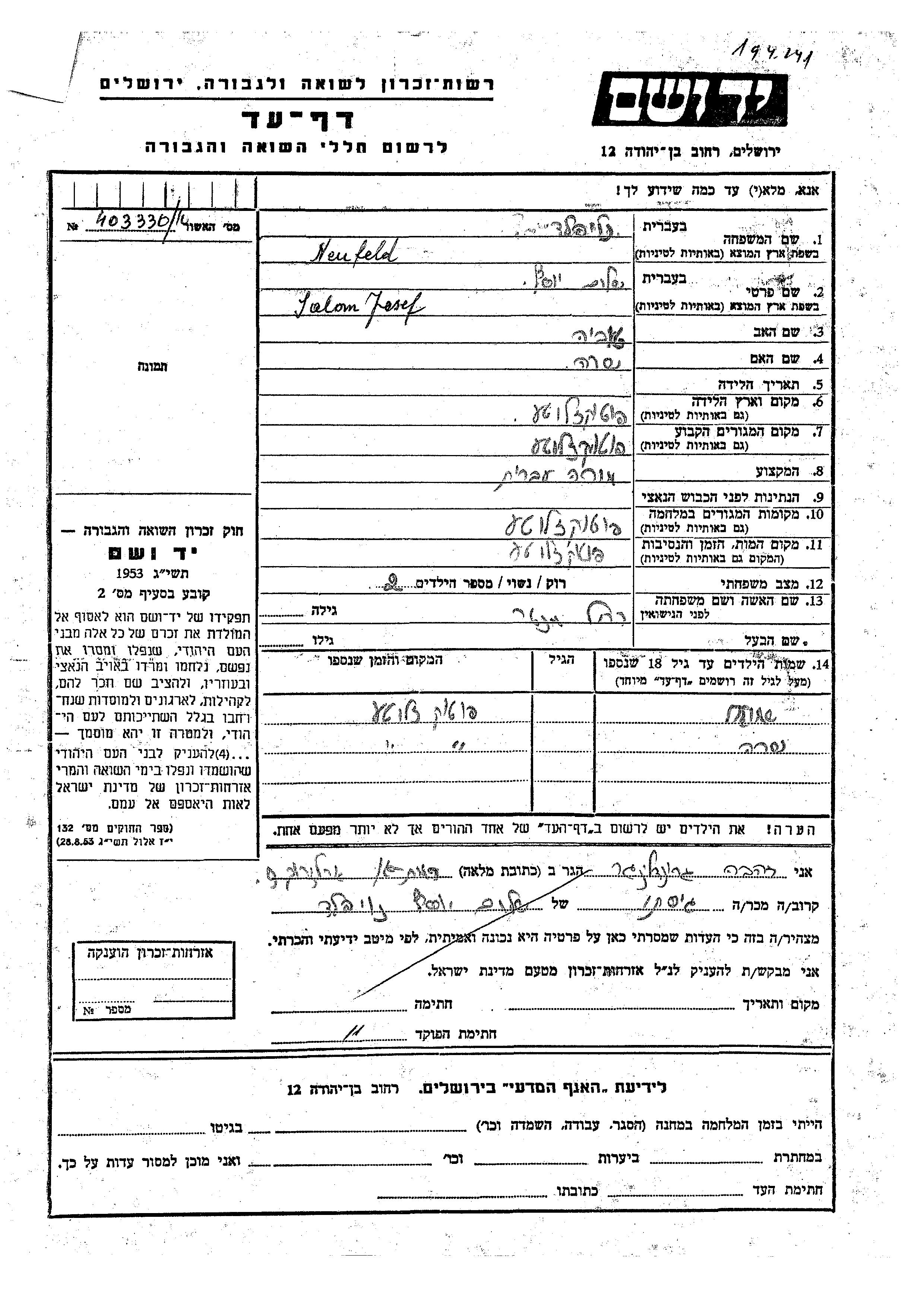 Neufeld Shalom Josef Potokzlote, Pologne Feuille de témoignage