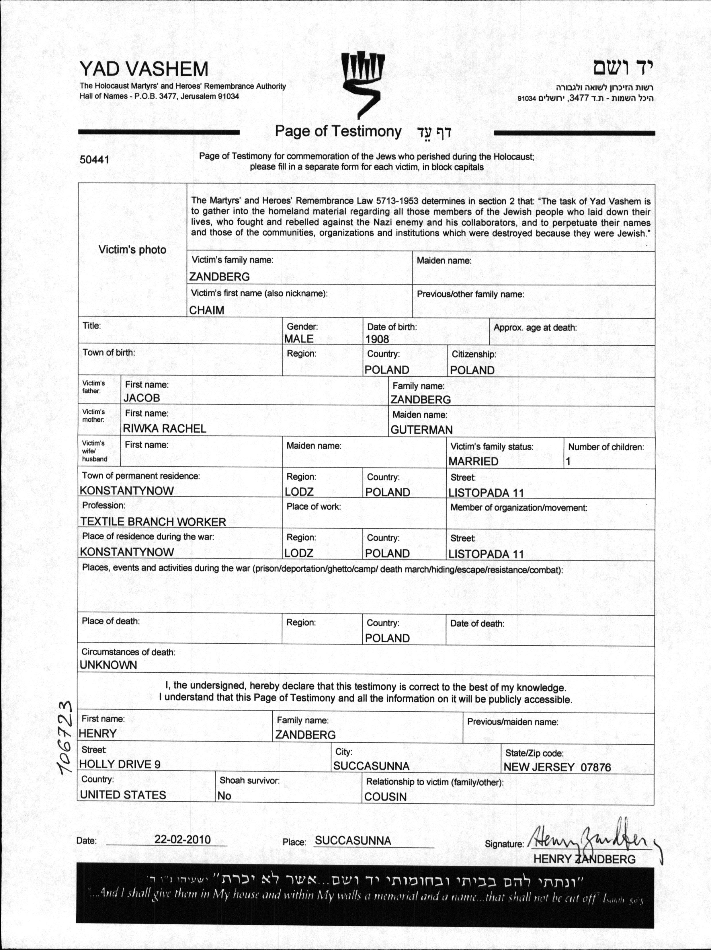 Zandberg Chaim 1908 Konstantynow Lodzki, Pologne Feuille de témoignage (digitale-signée)
