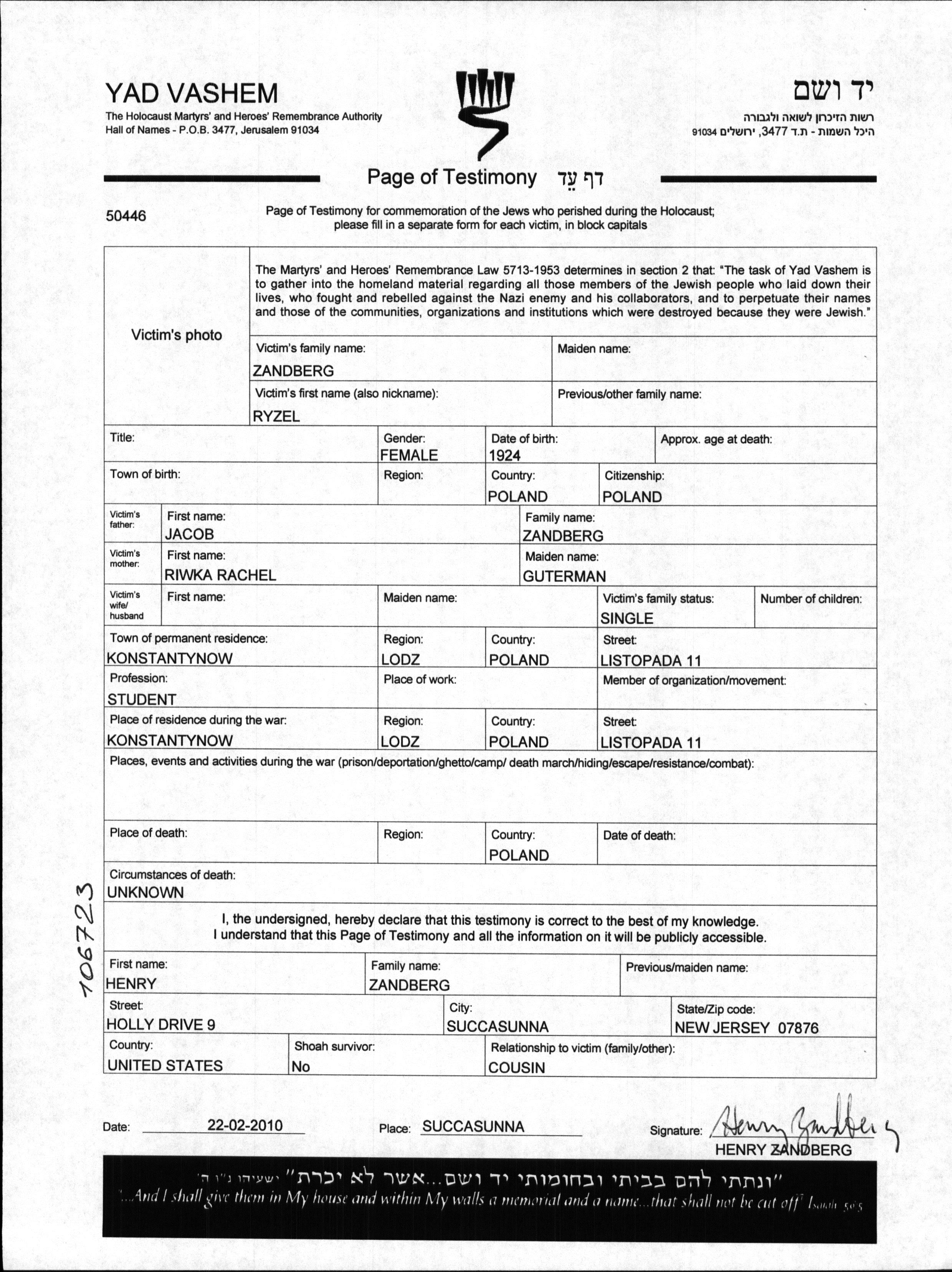 Ryzel Zandberg est née à Pologne en 1924, fille de Jacob et de Riwka Rachel née Guterman. Elle était Étudiant/e et Célibataire. Avant la seconde guerre mondiale elle vivait à Konstantynow Lodzki, Pologne. Pendant la guerre, elle était à Konstantynow Lodzki, Pologne.