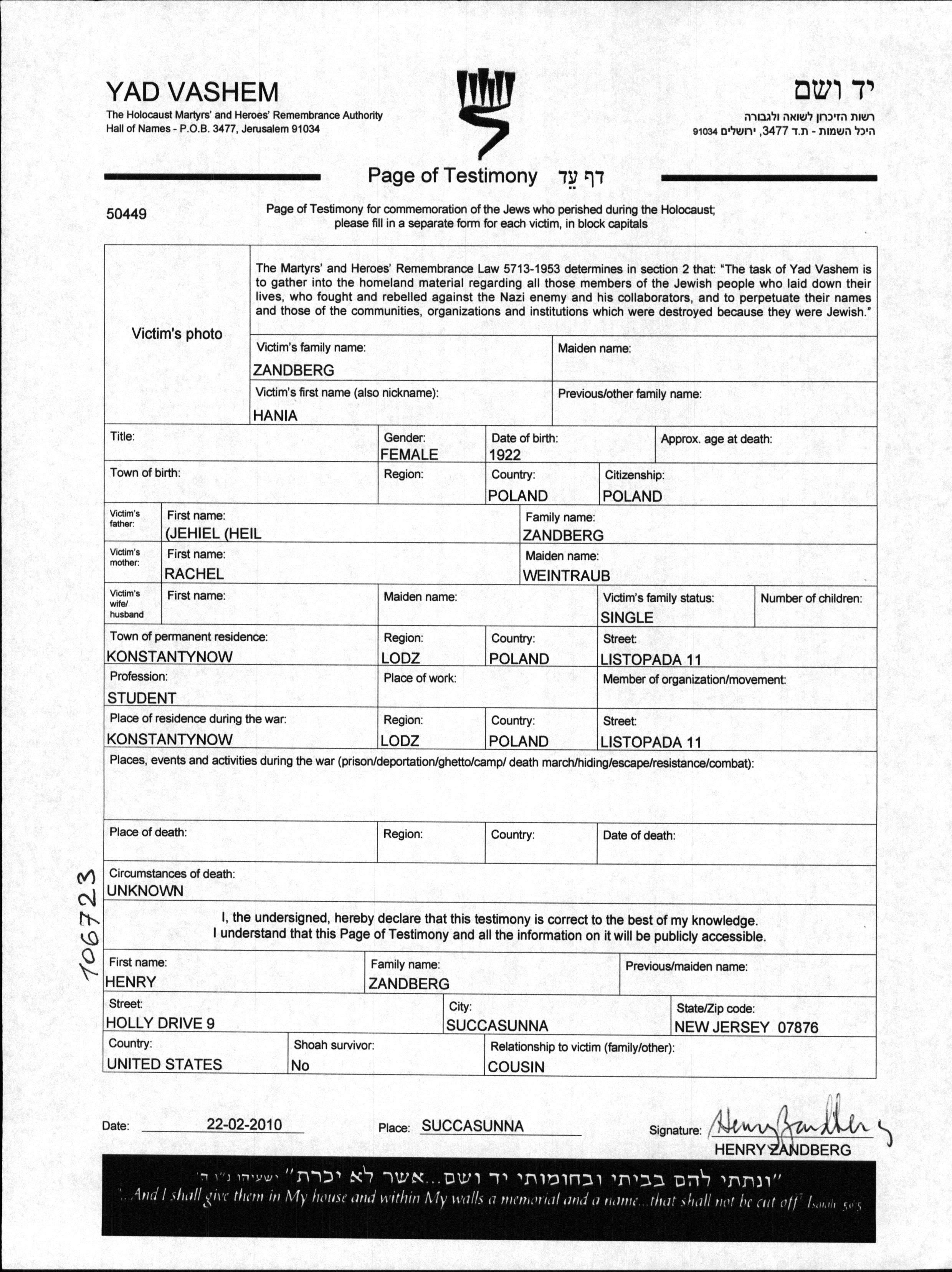 Zandberg Hania 1922 Konstantynow Lodzki, Pologne Feuille de témoignage (digitale-signée)