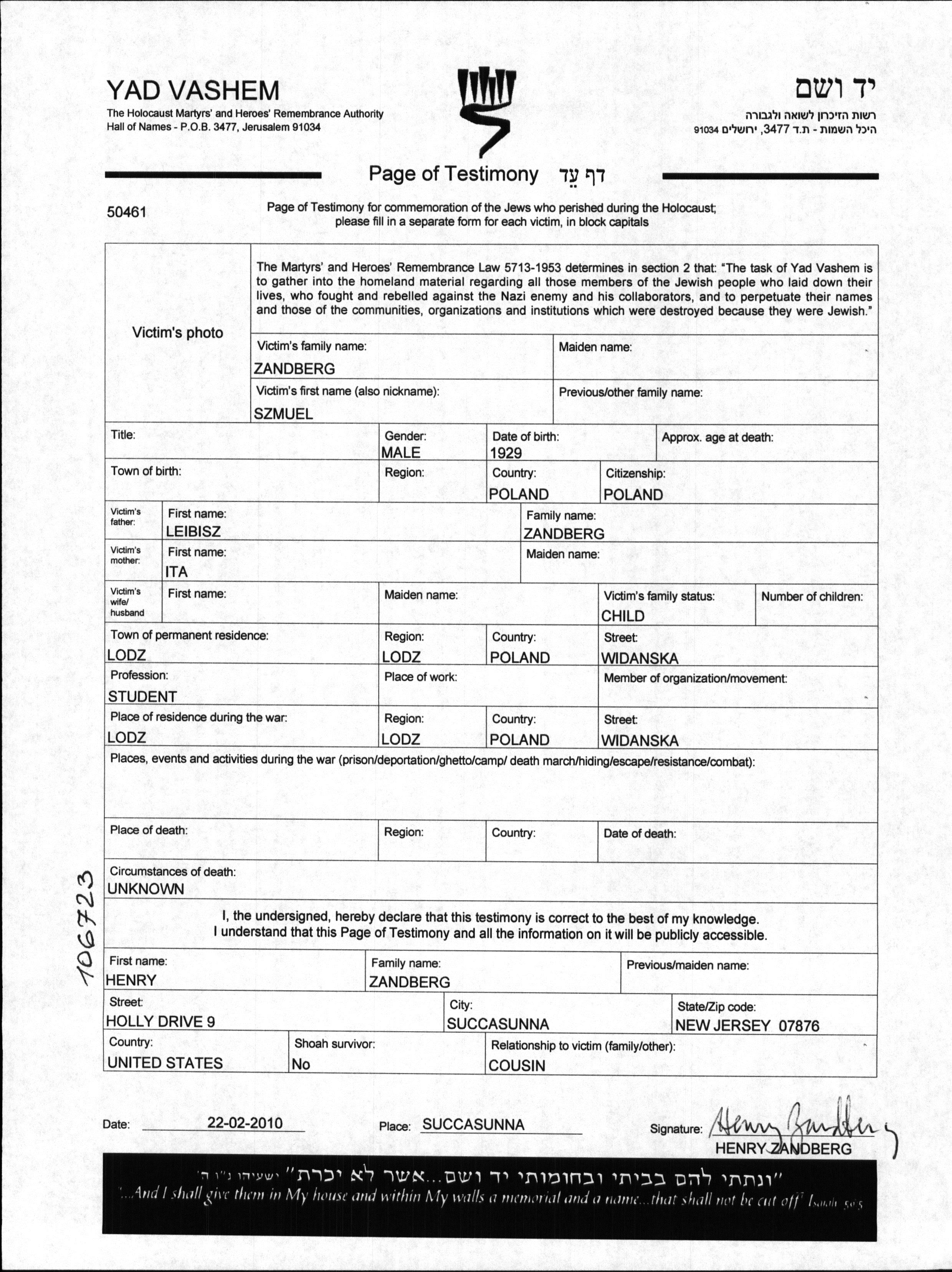 Zandberg Szmuel 1929 Lodz, Pologne Feuille de témoignage (digitale-signée)
