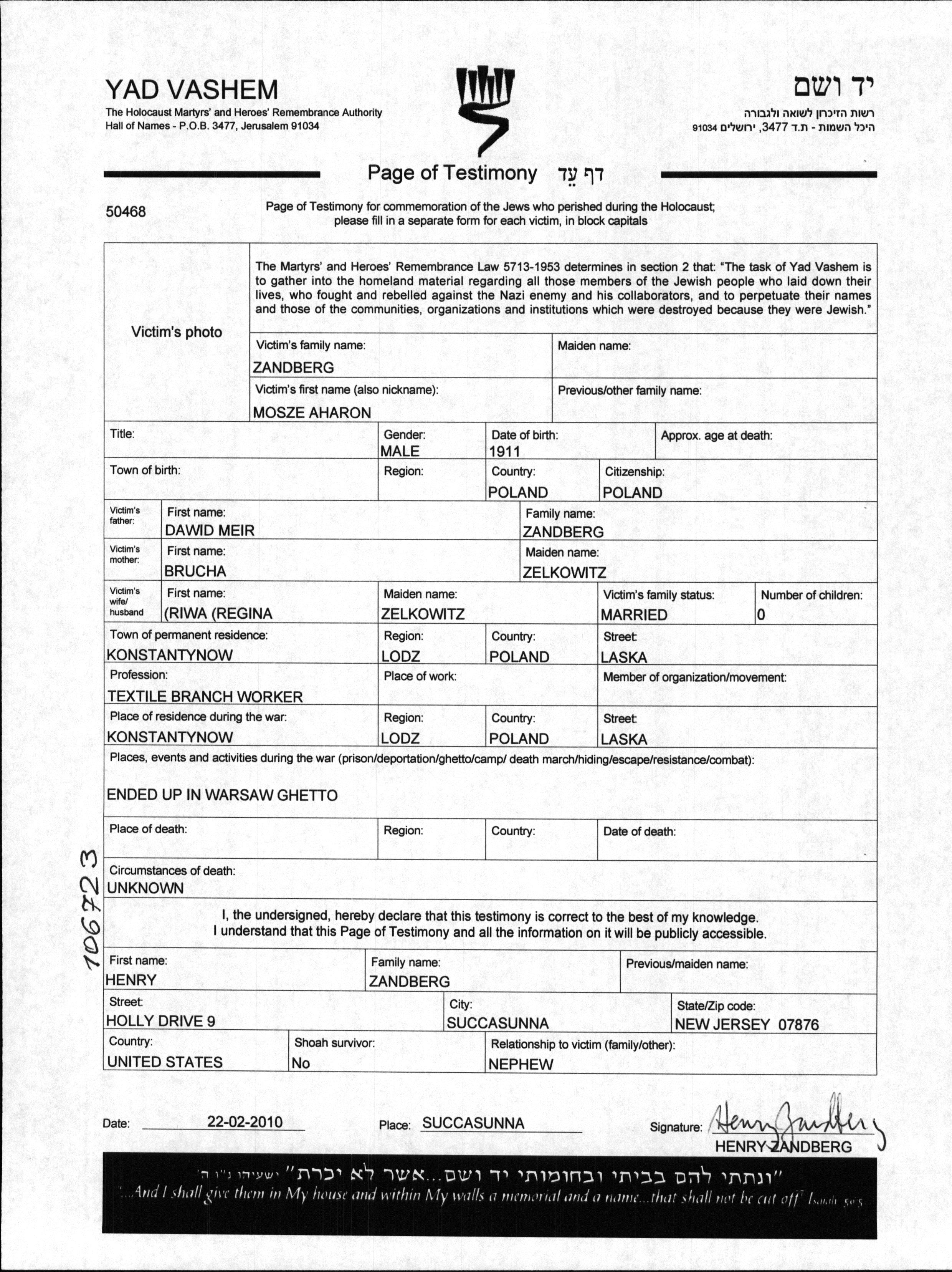 Mosze Aharon Zandberg est né à Pologne en 1911, fils de Dawid Meir et de Brucha née Zelkowitz. Il était Travailleur dans l'industrie du textile et Mariée à Riwa Regina née Zelkowitz. Avant la seconde guerre mondiale il vivait à Konstantynów, Pologne. Au cours de la guerre, il était à Konstantynów, Pologne.