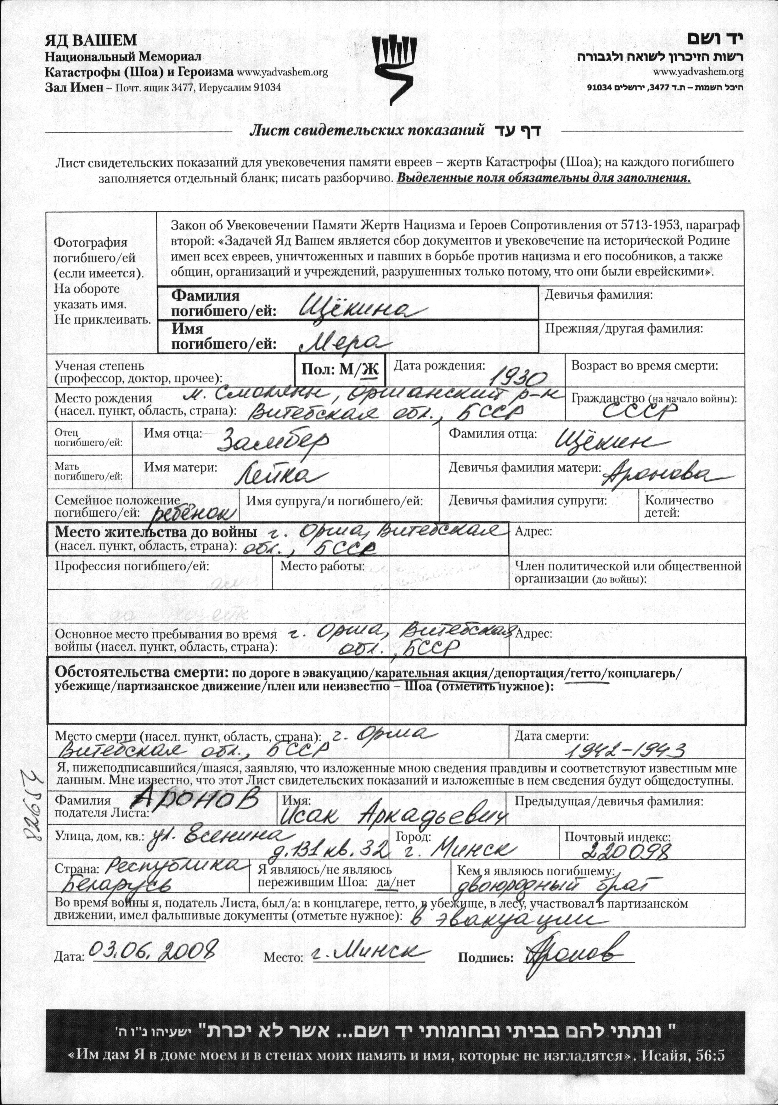 Mera Shchyokina est née à Smolyany, Bélorussie (URSS) en 1930, fille de Zamber et de Leika née Aronova. Elle était Enfant. Avant la seconde guerre mondiale elle vivait à Orsha, Bélorussie (URSS). Pendant la guerre, elle était à Orsha, Bélorussie (URSS).