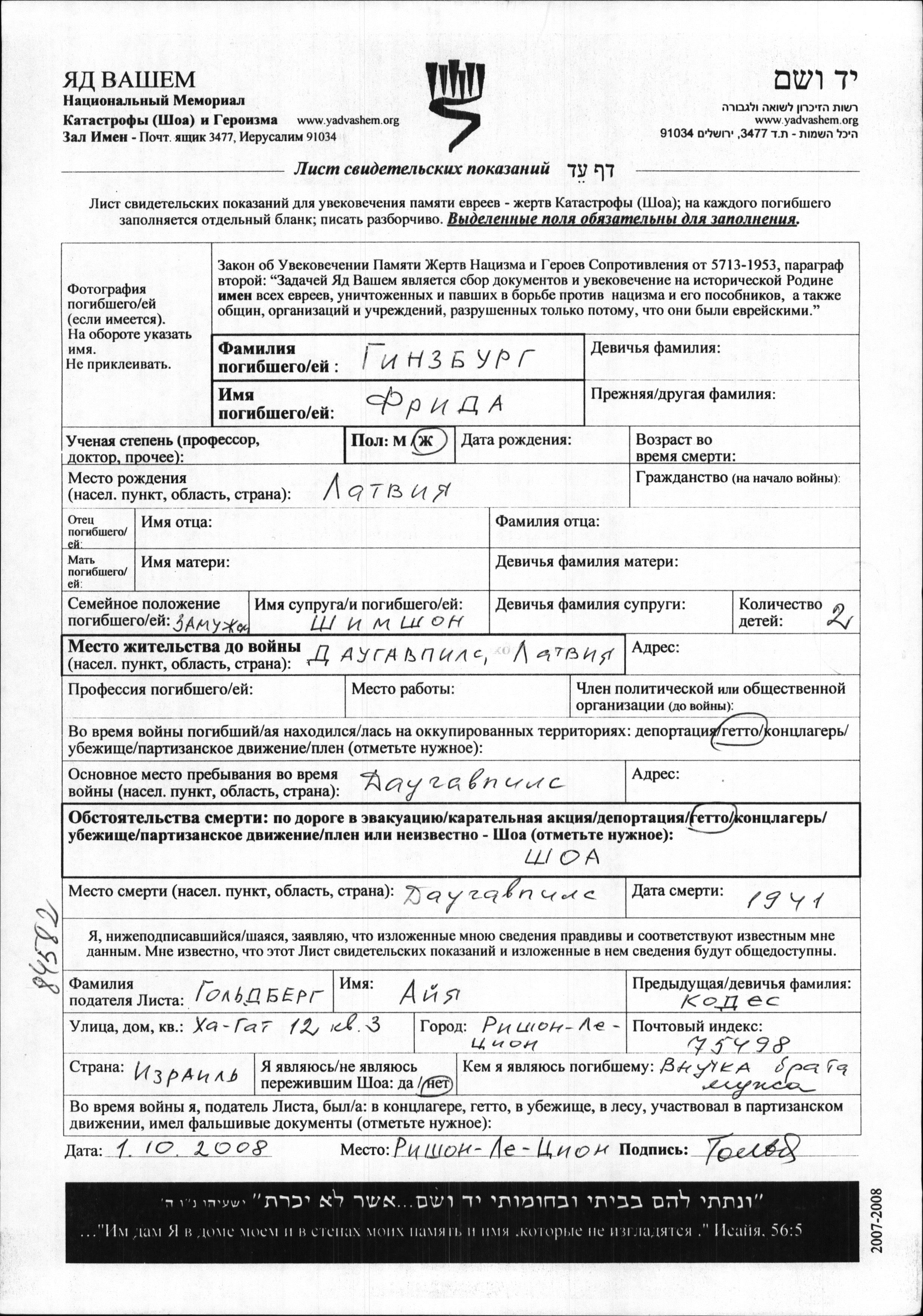 Ginzburg Frida Daugavpils, Lettonie Feuille de témoignage