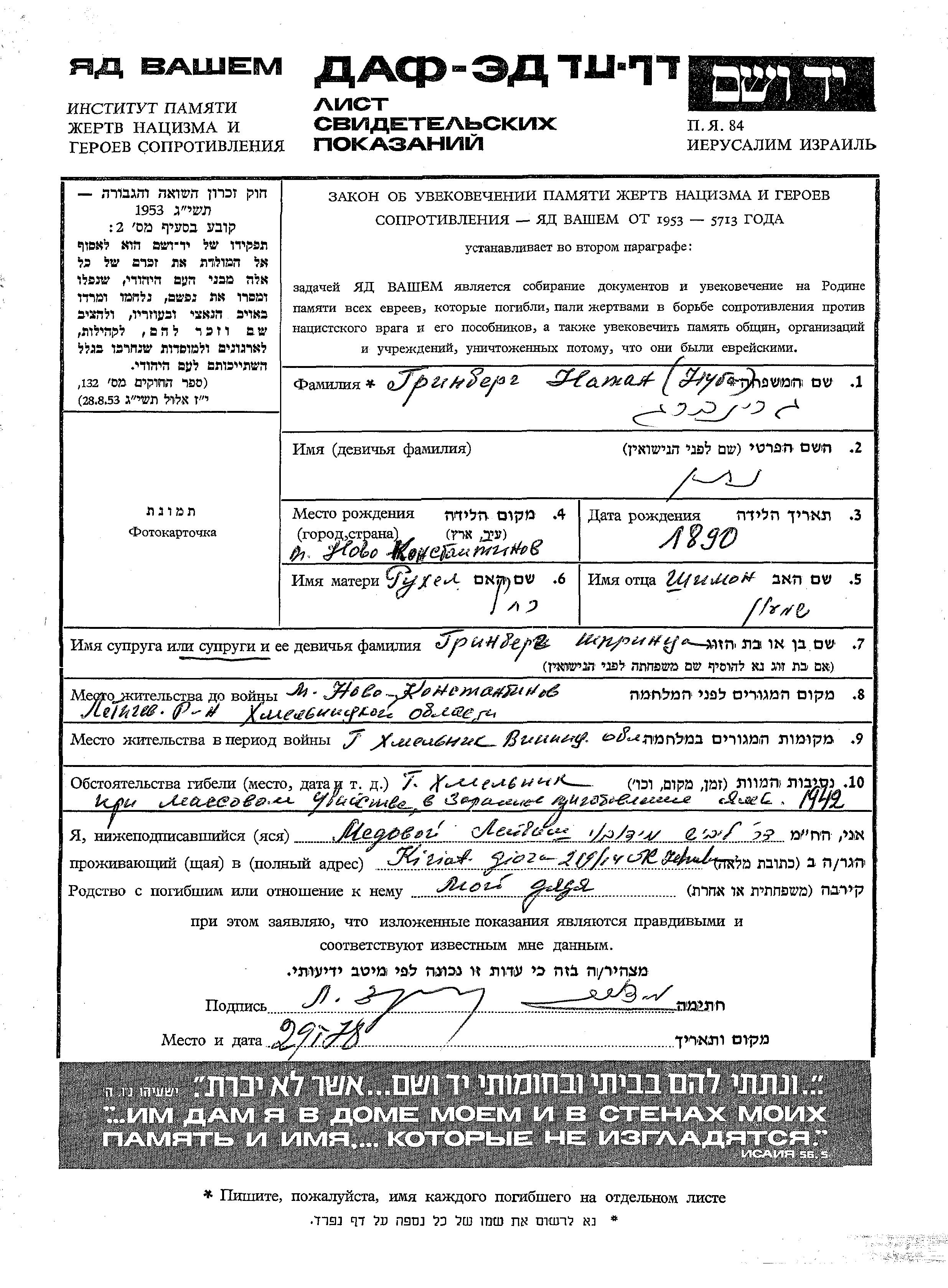 Grinberg Nuba 1890 Novo Konstantinov, Ukraine (URSS) Feuille de témoignage