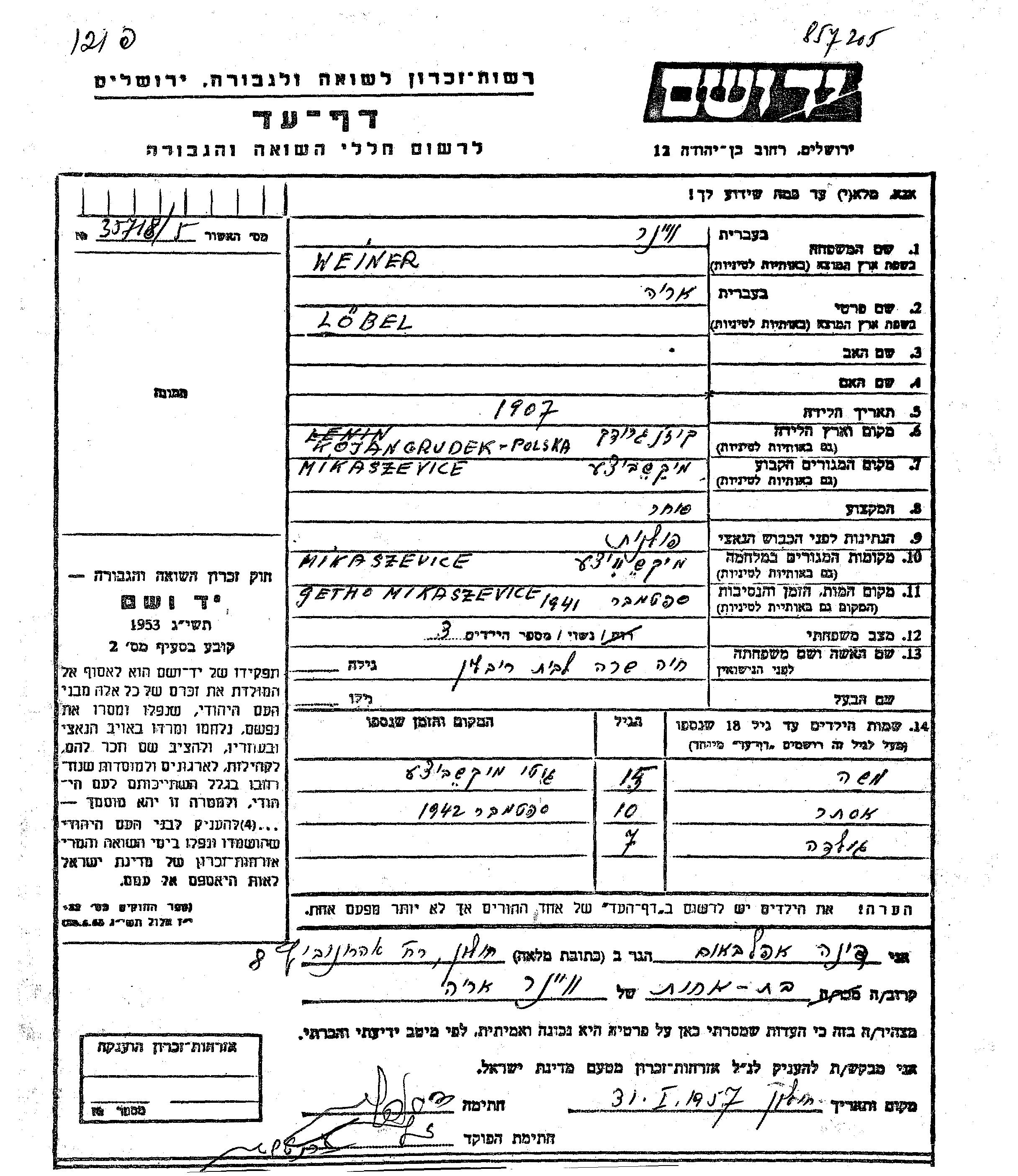 Weiner Lobel Arie 1907 Mikaszewicze, Pologne Feuille de témoignage