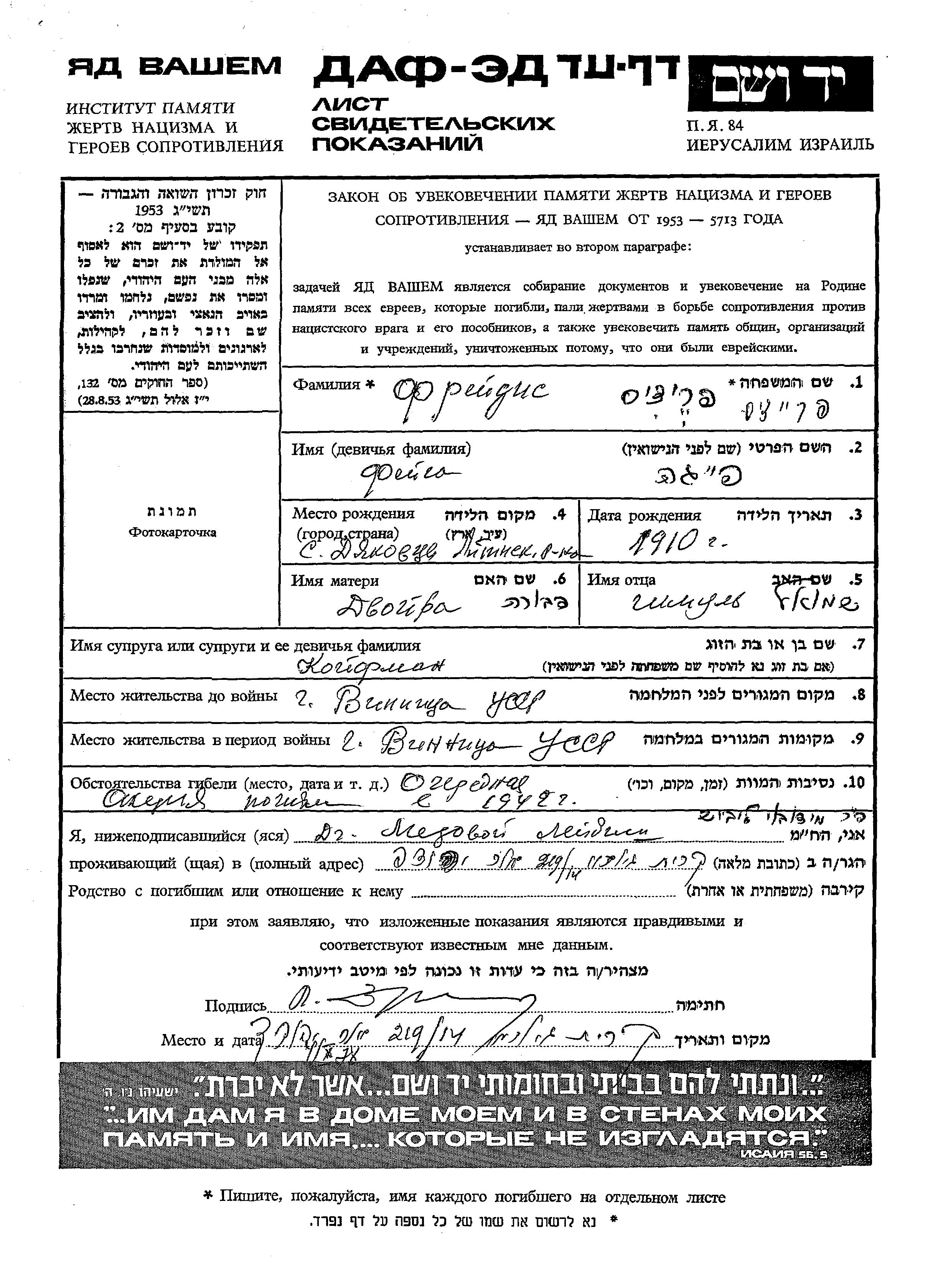 Freidis Feiga 1910 Vinnitza, Ukraine (URSS) Feuille de témoignage
