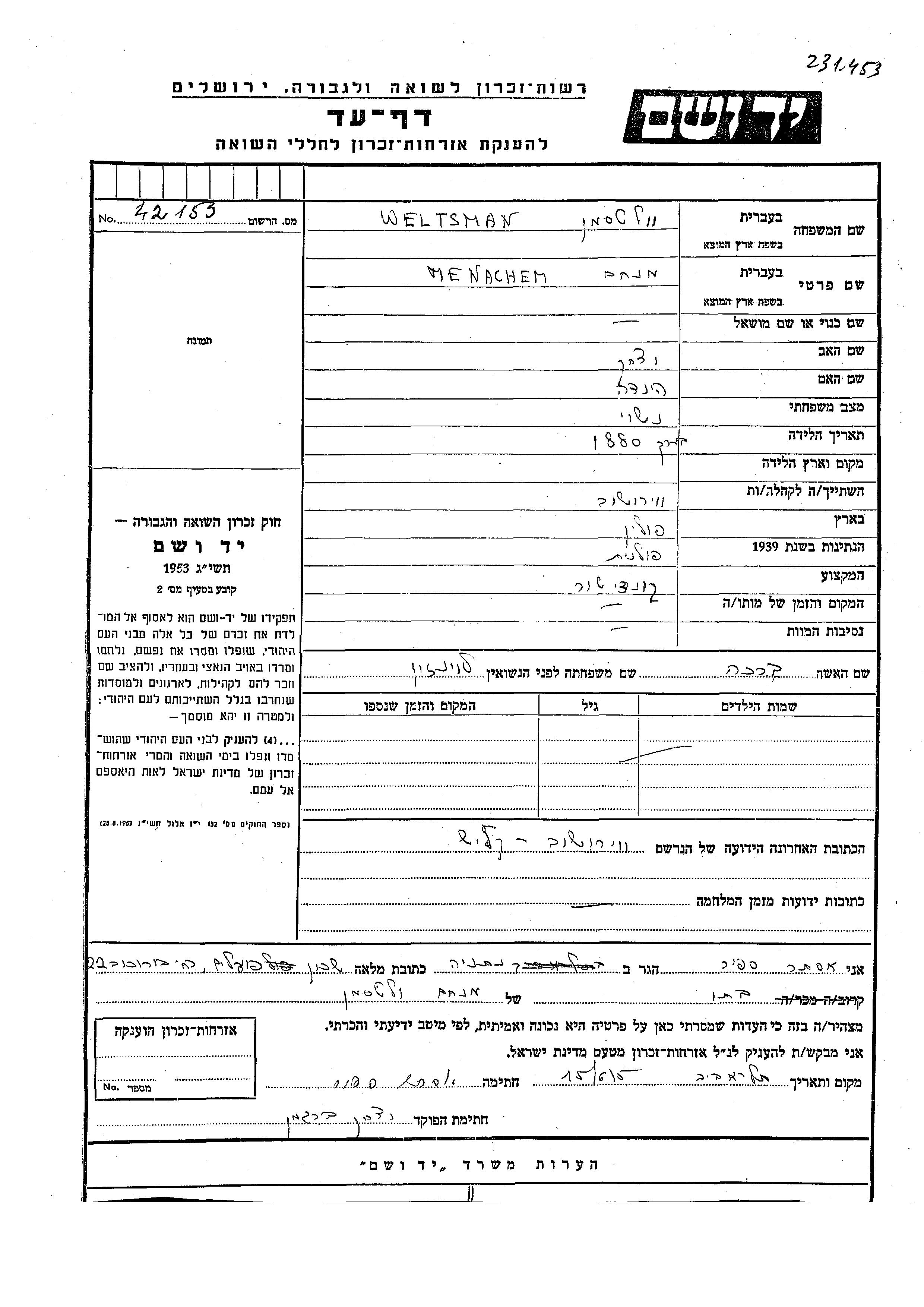 Weltsman Menachem 1880 endroit inconnu, Feuille de témoignage