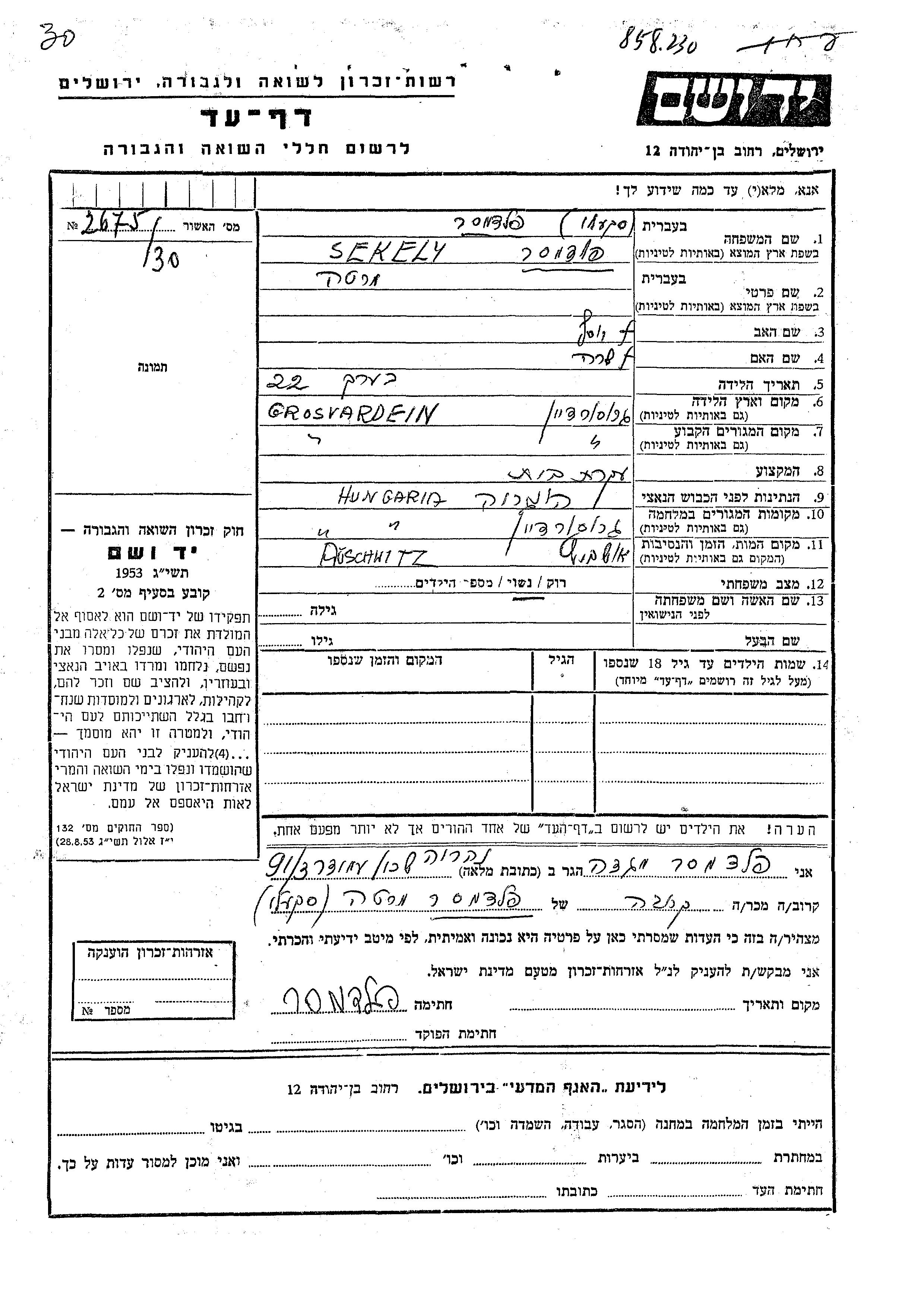Szekely Marta Grosswardein, Roumanie Feuille de témoignage