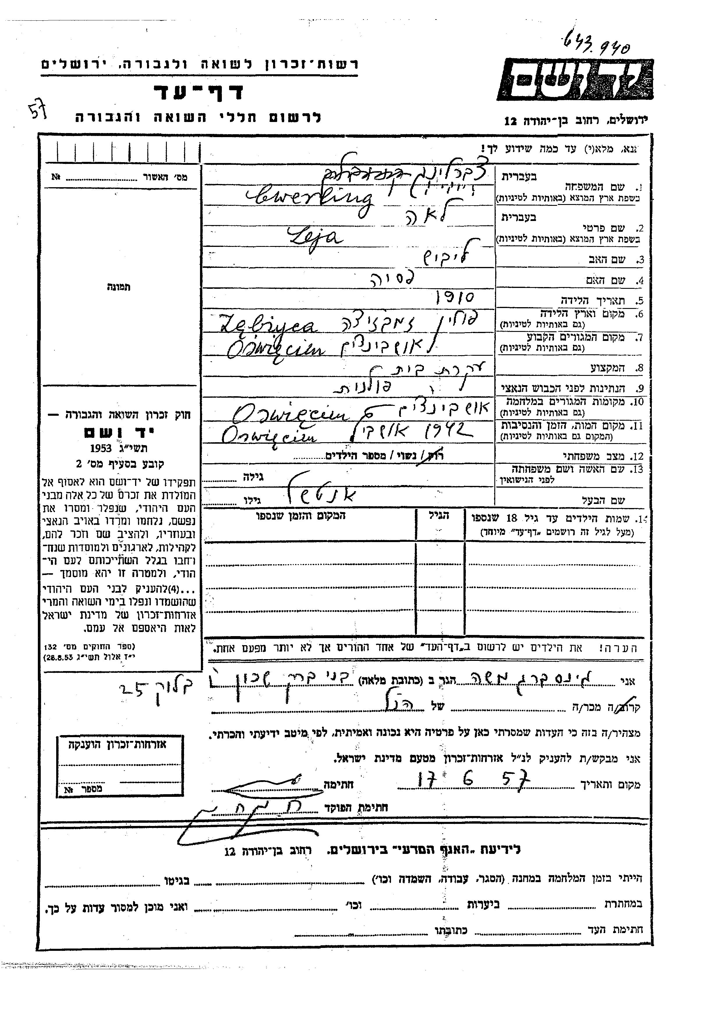 Cwerling Leja 1910 Oświęcim, Pologne Feuille de témoignage