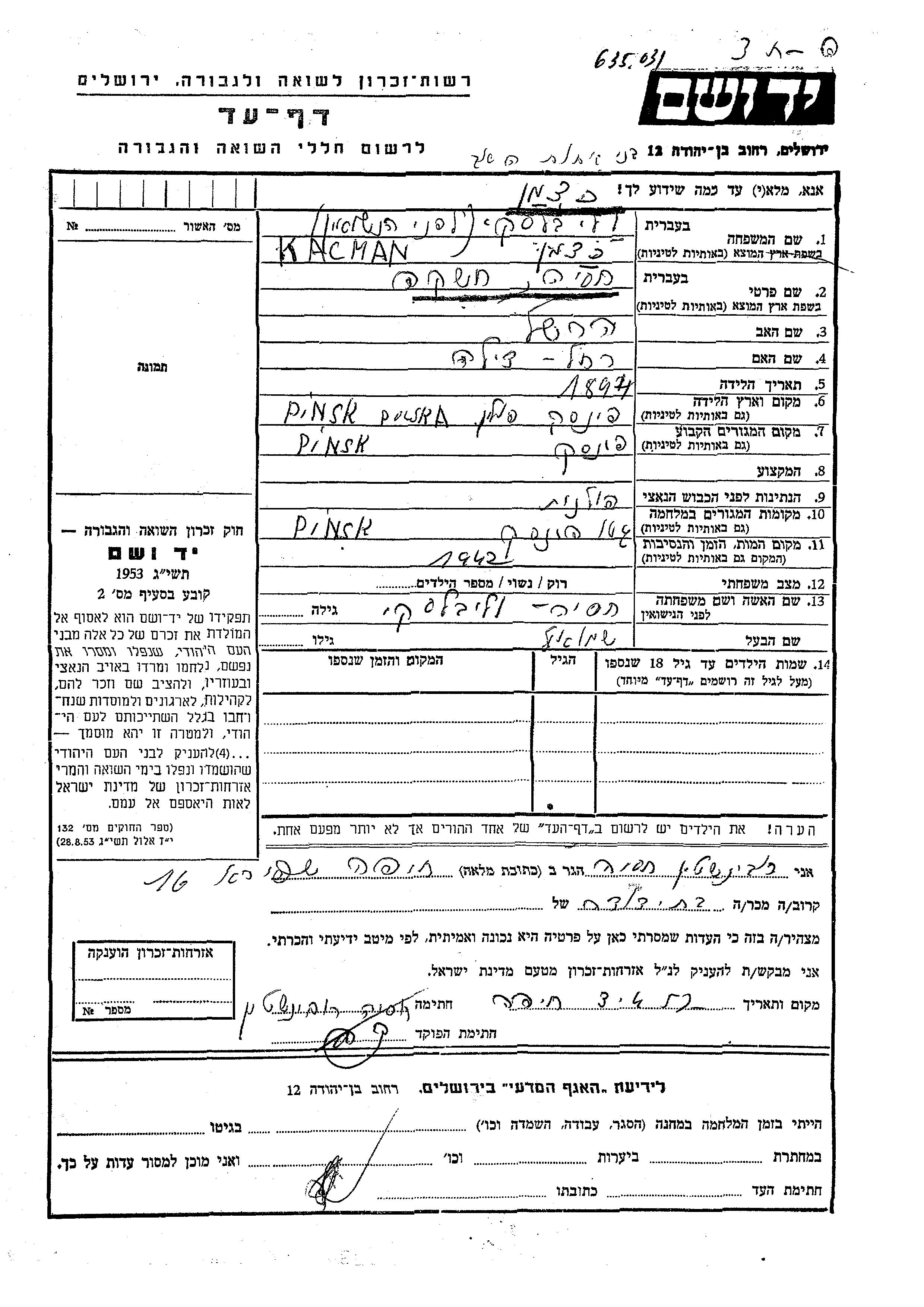 Yad Vashem - Pages of Testimony Names Memorial Collection