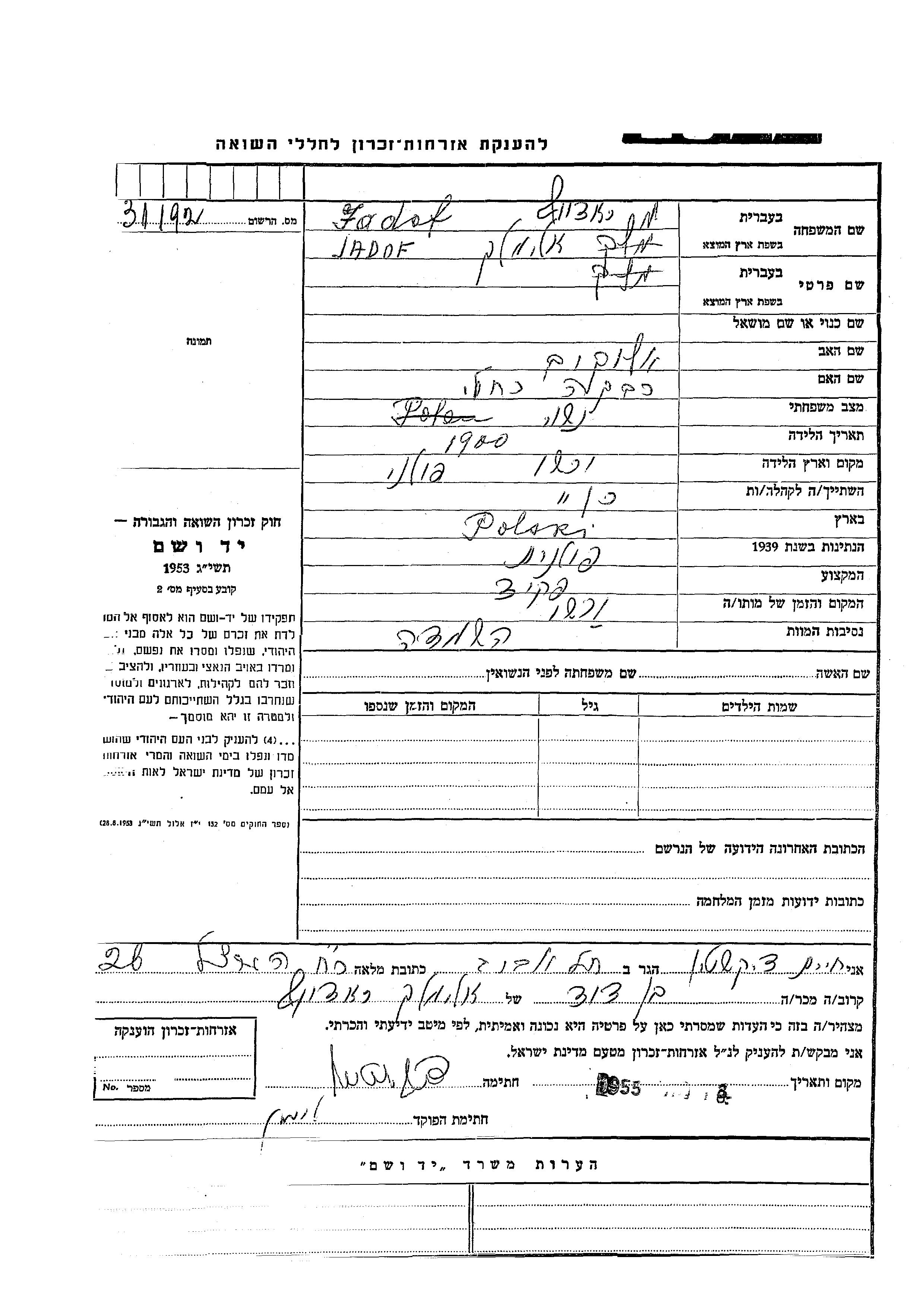 Jadof Elimelekh 1900 endroit inconnu, Feuille de témoignage