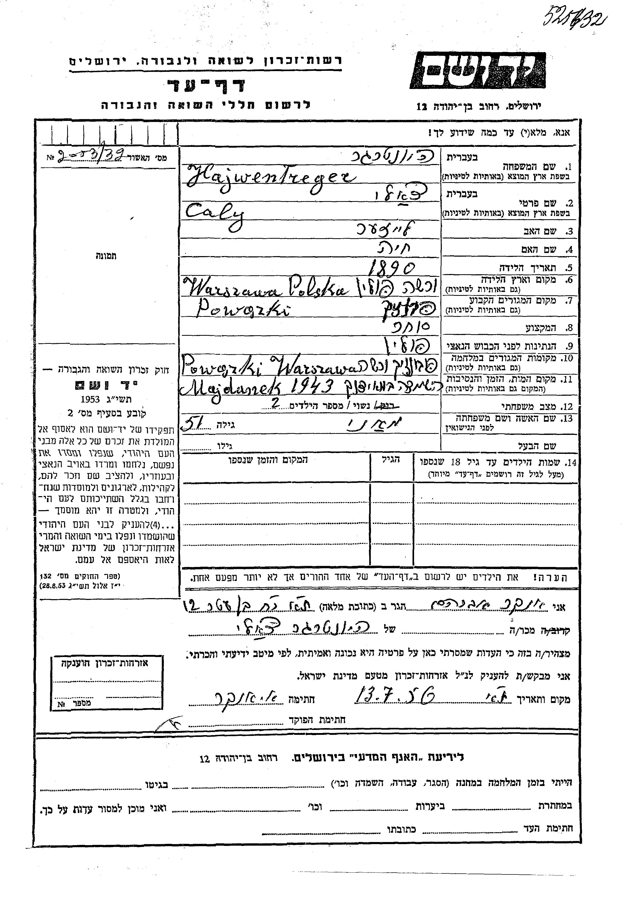 Caly Hajwentreger est né à Warszawa, Pologne en 1890, fils de Leizer et de Khaia. Il était Commerçant/e et Mariée à Mani. Avant la seconde guerre mondiale il vivait à Powazki, Pologne. Au cours de la guerre, il était à Powazki, Pologne.