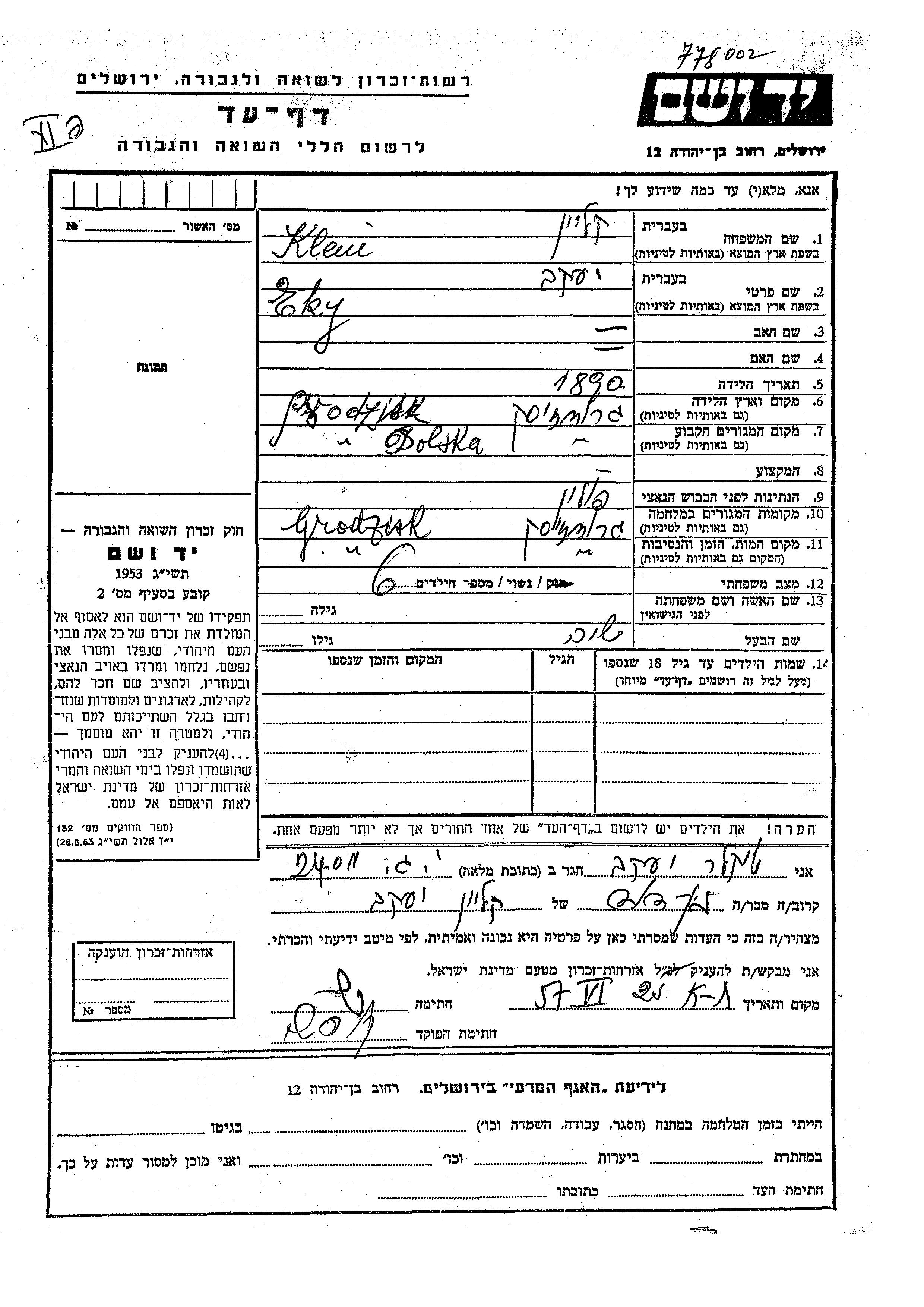 Klein Eky Yaakov 1890 Grodzisk Mazowiecki, Pologne Feuille de témoignage