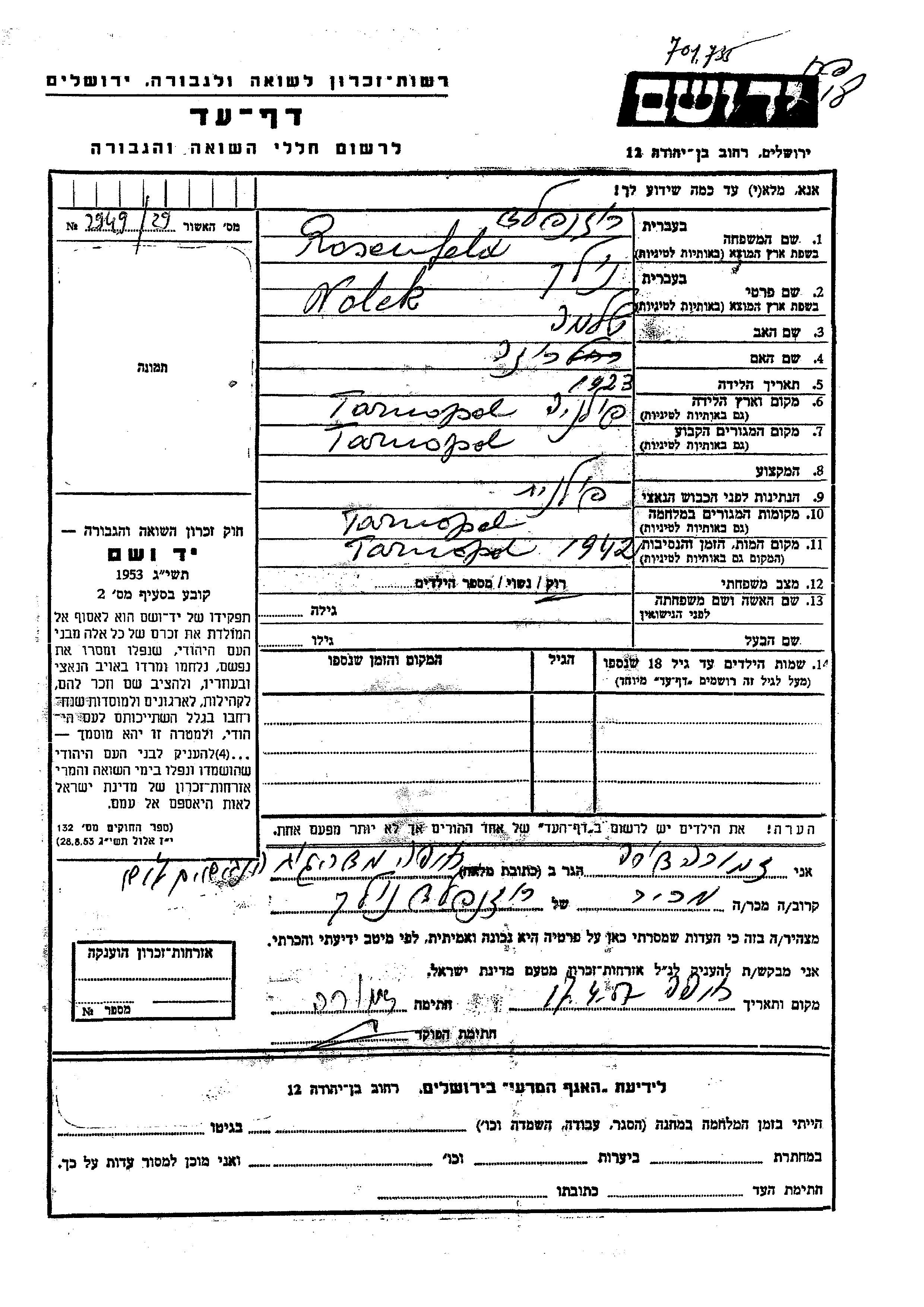 Rosenfeld Nolek 1923 Tarnopol, Pologne Feuille de témoignage