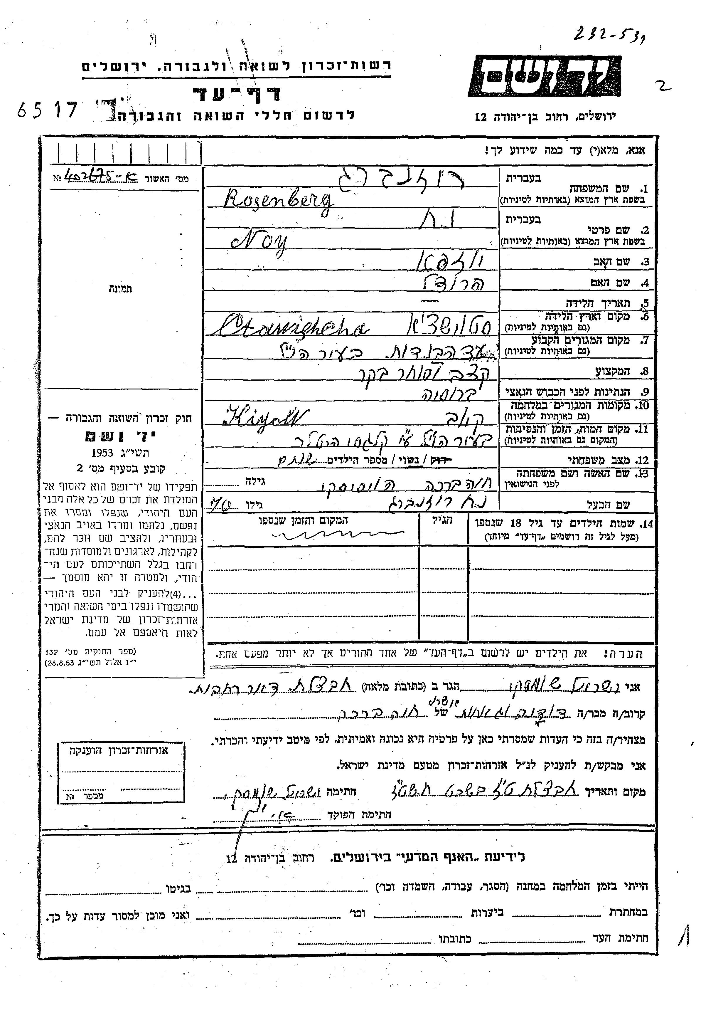 Noy Rosenberg est né à Stawiszcze, Ukraine (URSS), fils de Iozefa et de Frodel. Il était Négociant en bétail et Mariée à Khava Brakha née Khaikovski. Avant la seconde guerre mondiale il vivait à Stawiszcze, Ukraine (URSS). Au cours de la guerre, il était à Kiev, Ukraine (URSS).