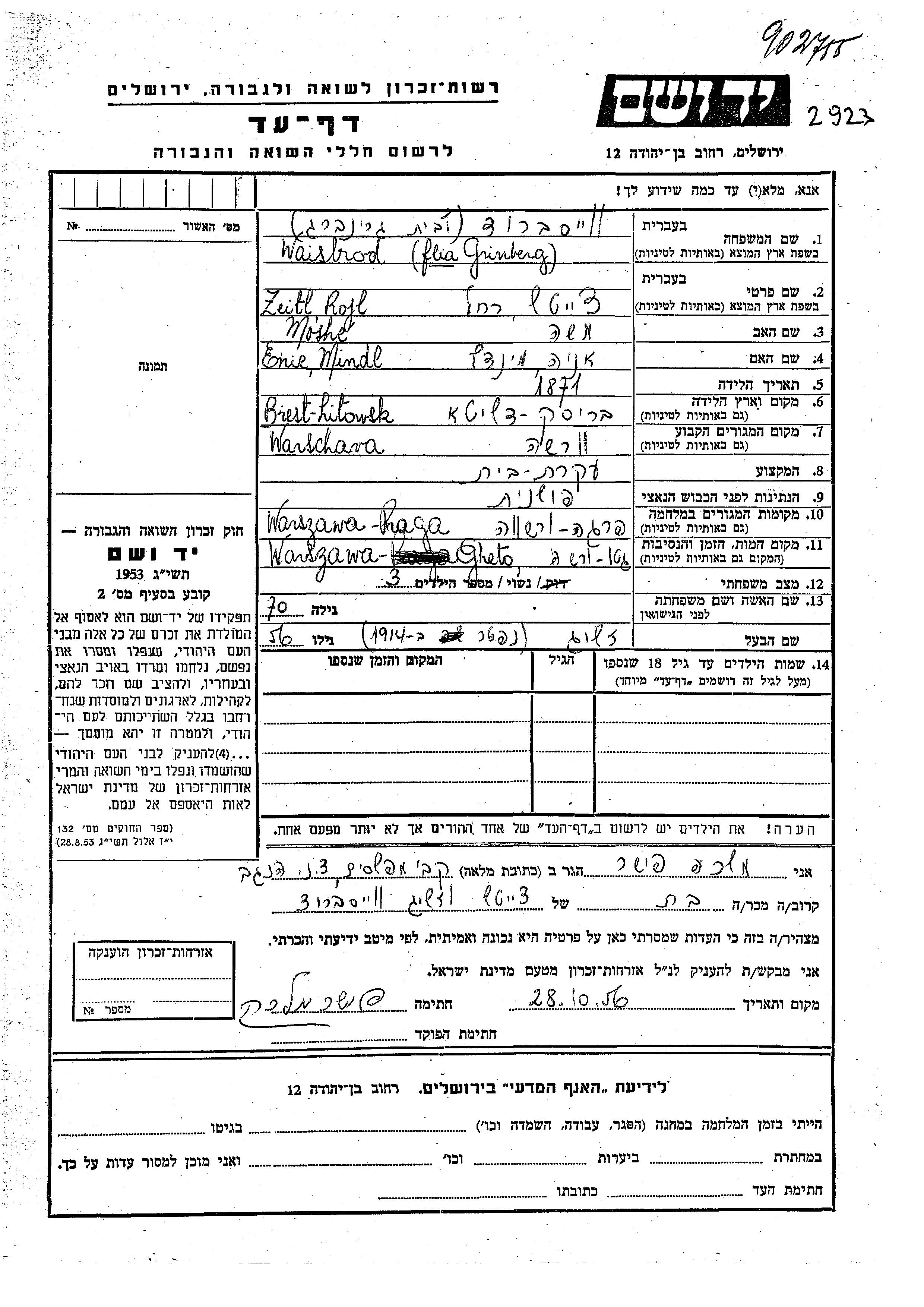 Zeitl Rajl Waisbrod née Grinberg est née à Brest Litowsk, Pologne en 1871, fille de Moshe et de Enie Mindl. Elle était Femme au foyer et Mariée à Zelig. Avant la seconde guerre mondiale elle vivait à Warszawa, Pologne. Pendant la guerre, elle était à Warszawa, Pologne.
