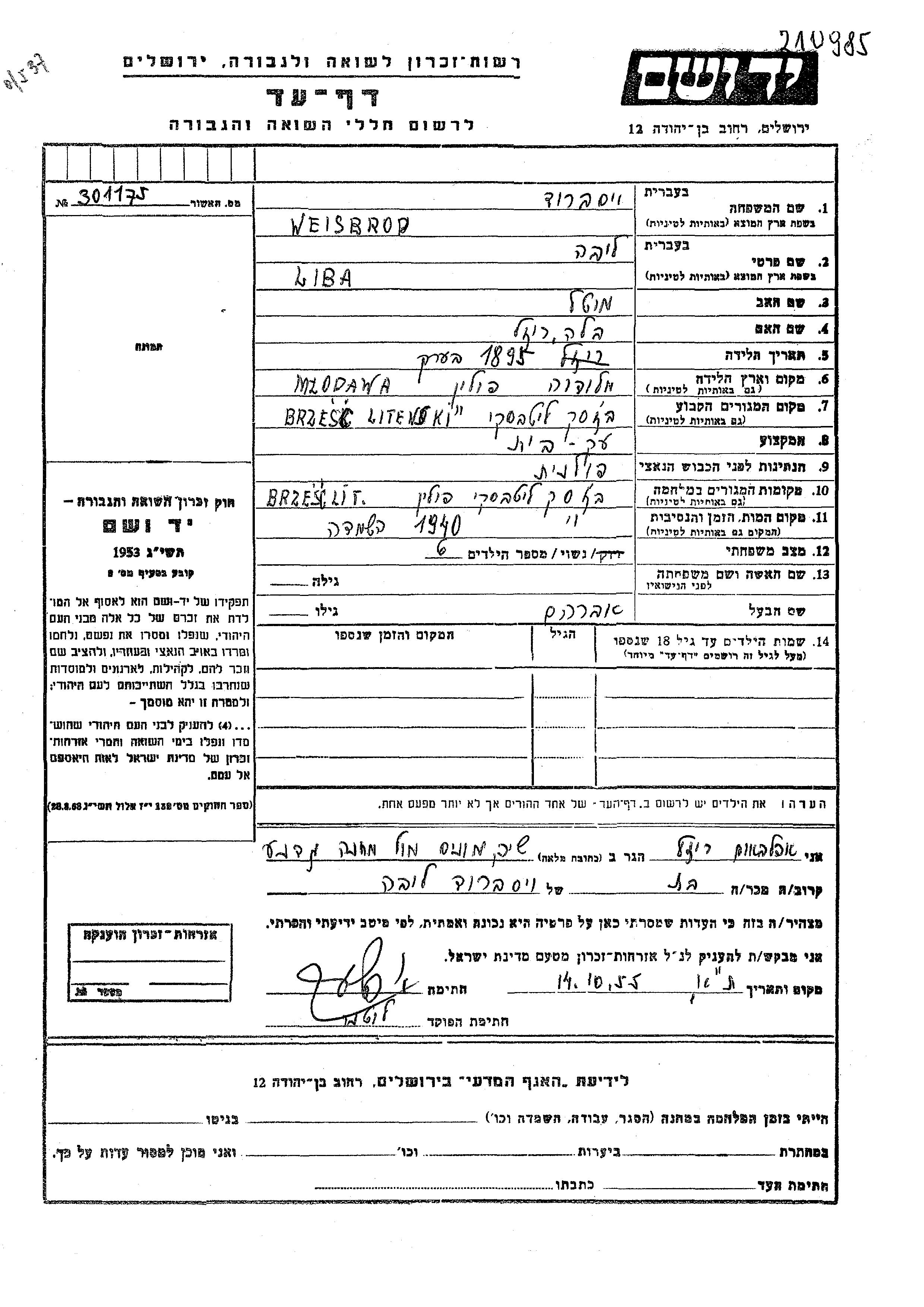 Liba Weisbrod est née à Wlodawa, Pologne en 1895, fille de Motel et de Bela Reizel. Elle était Femme au foyer et Mariée à Avraham. Avant la seconde guerre mondiale elle vivait à Brzesc Litewski, Pologne. Pendant la guerre, elle était à Brzesc Litewski, Pologne.