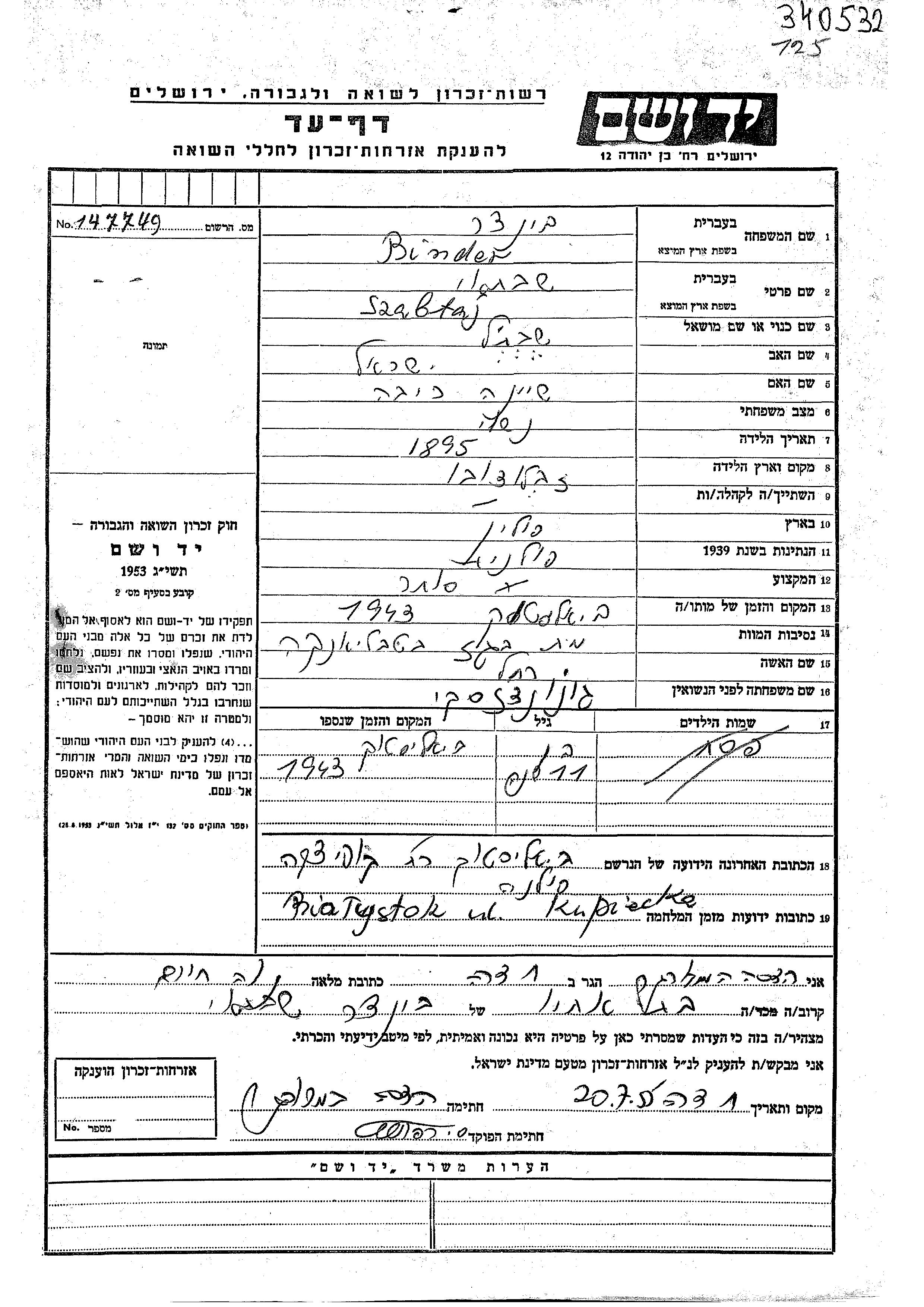 Szabtaj Binder est né à Zabludowe, Pologne en 1895, fils de Yisrael et de Sheina Riva. Il était Commerçant/e et Mariée à Rakhel née Goniondzki. Au cours de la guerre, il était à Bialystok, Pologne.