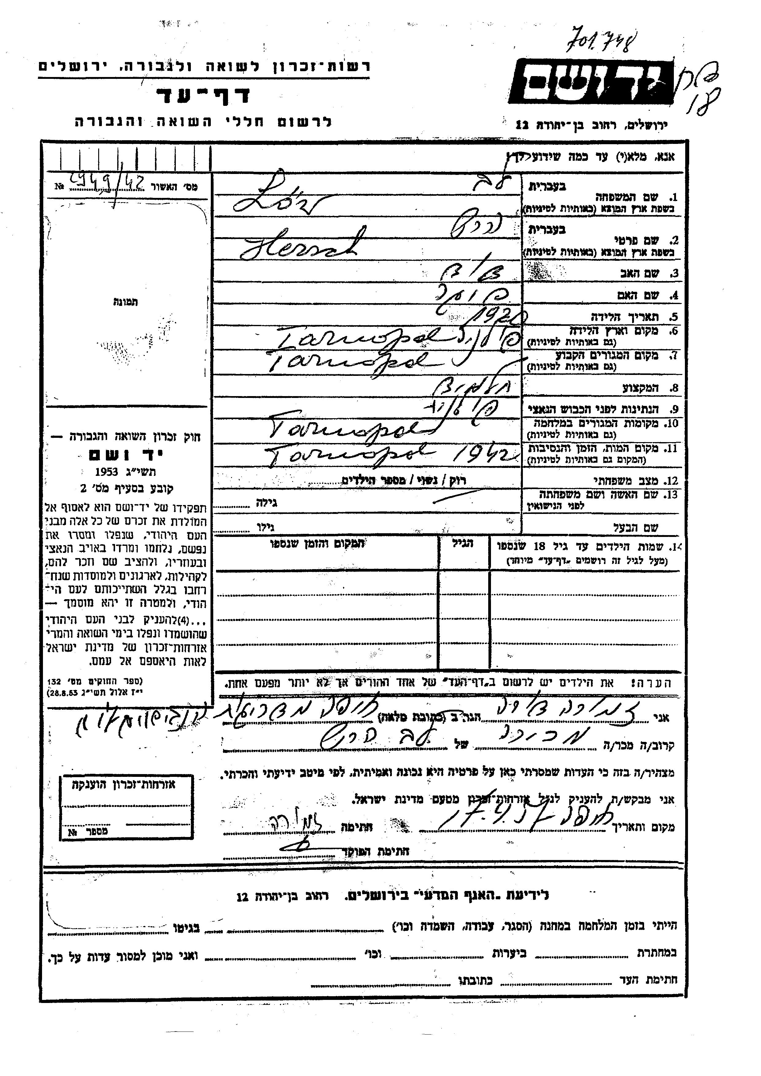 Low Hersch 1920 Tarnopol, Pologne Feuille de témoignage