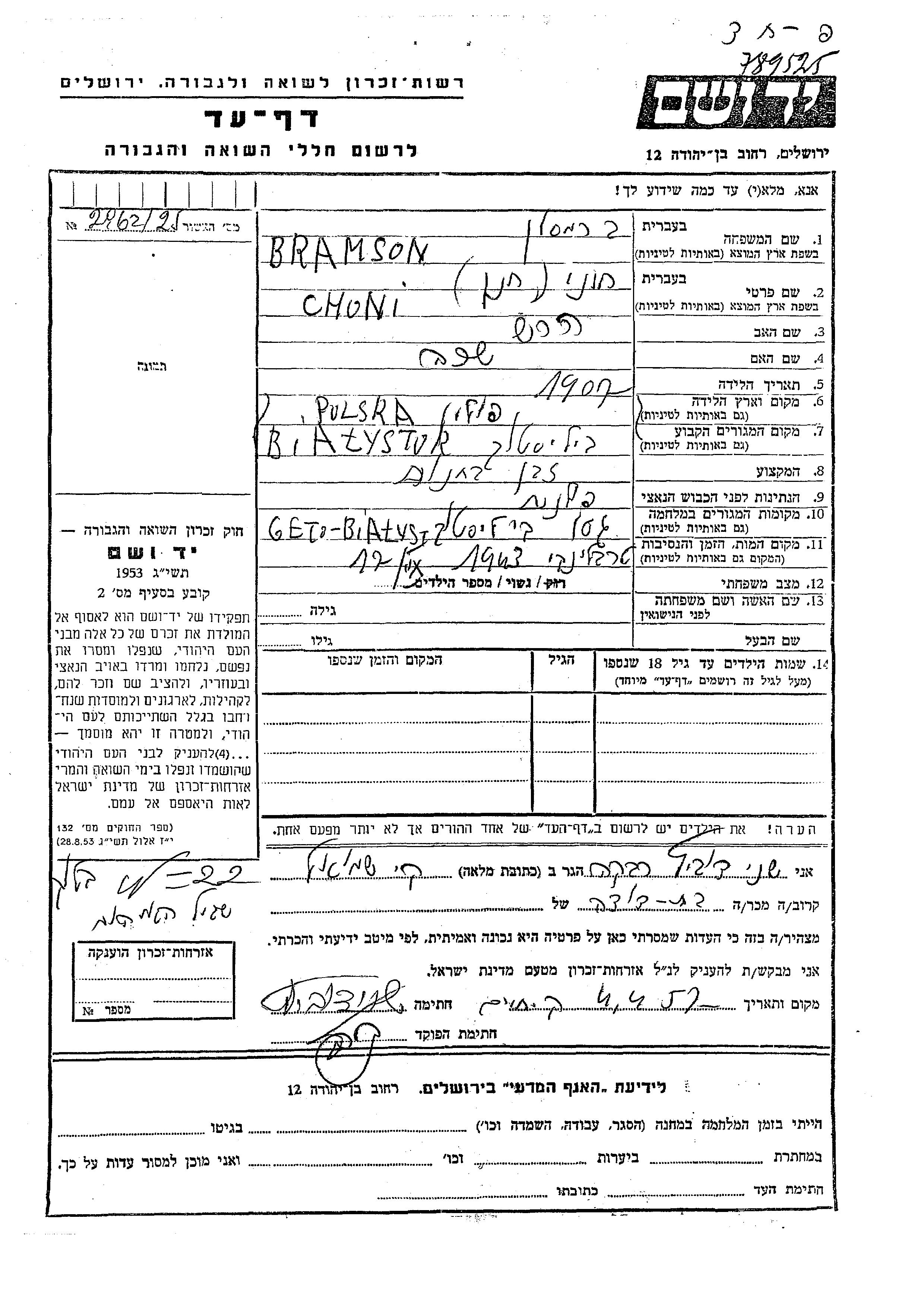 Bramson Choni 1907 Bialistok, Pologne Feuille de témoignage