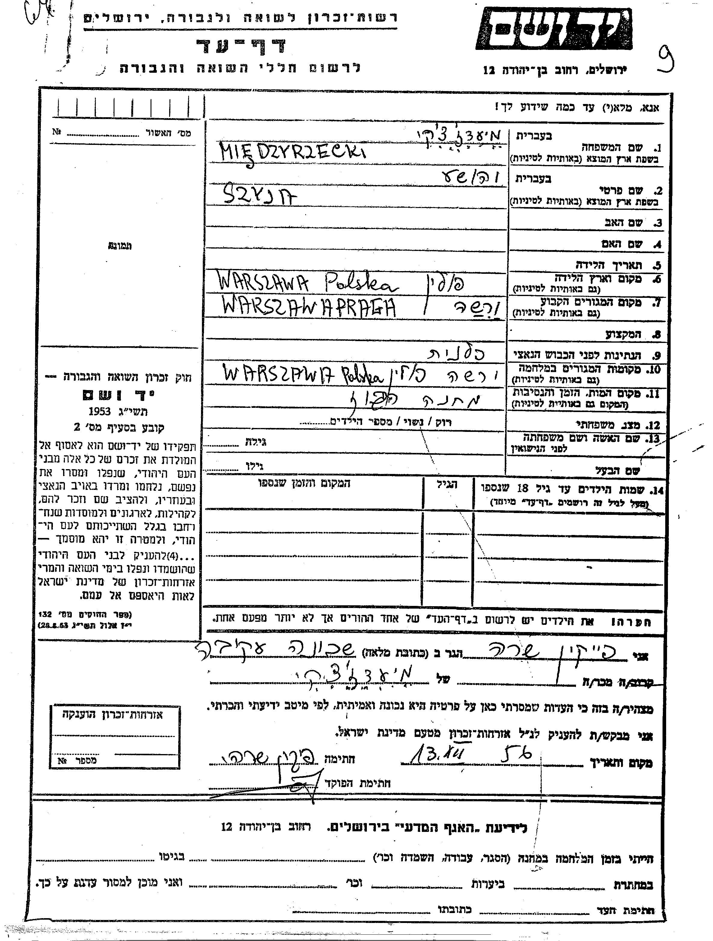 Miedzyrzecki Szyja Praga Warszawa, Pologne Feuille de témoignage