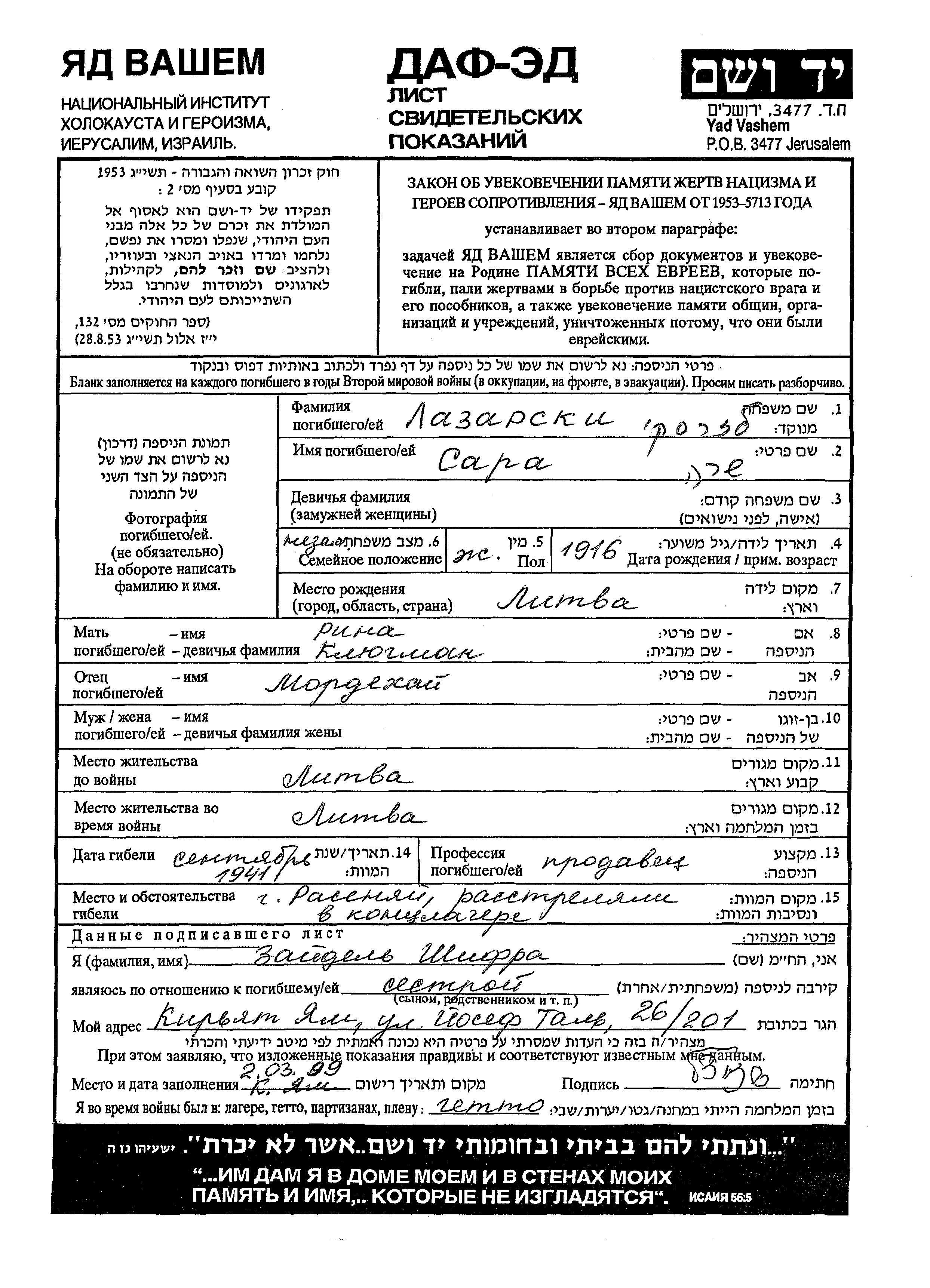 Lazarski Sara 1916 Lituanie Feuille de témoignage